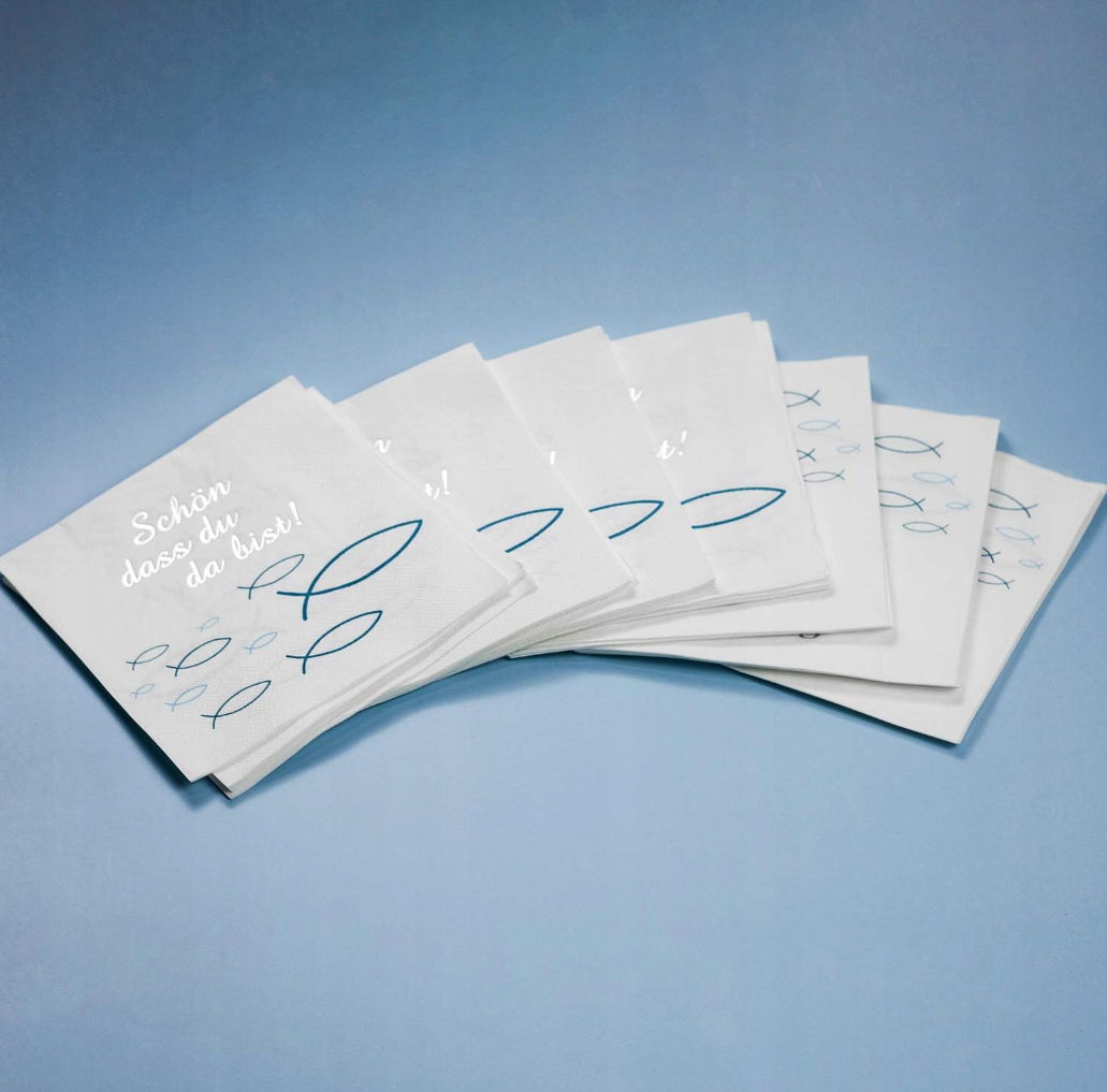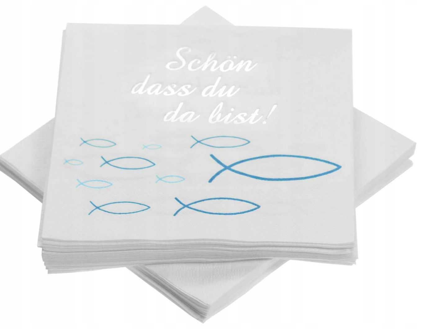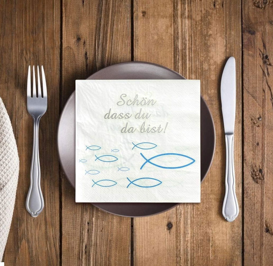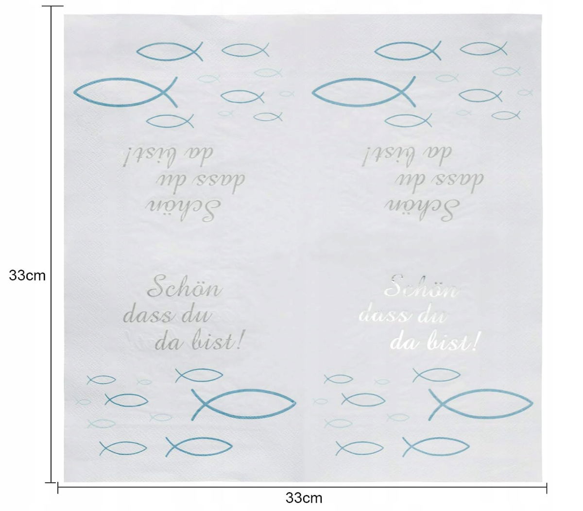 - ✴️ 32 sztuki serwetek z rybami "Schön, dass du da bist!" 33 x 33 cm (po rozłożeniu).
