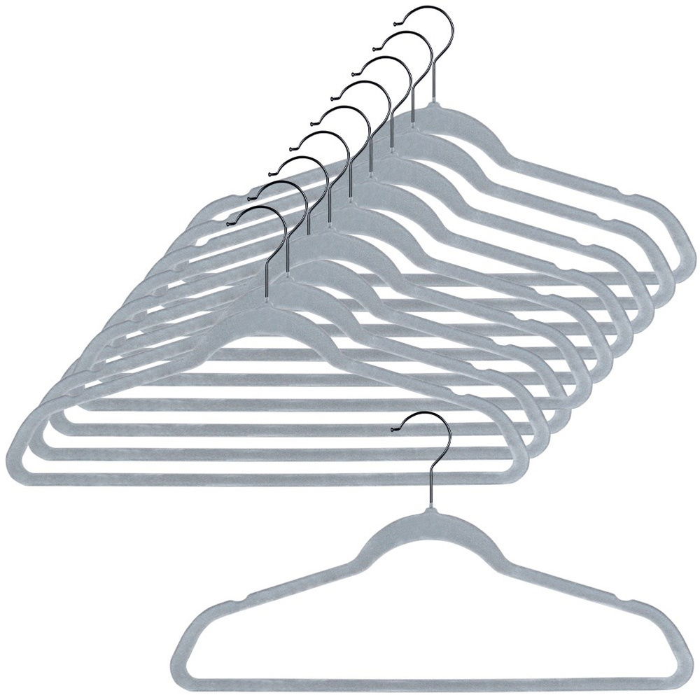 Zestaw 10 wieszaków na ubrania - Zestaw 10 uniwersalnych wieszaków na ubrania w kolorze szarym. Idealne dla osób ceniących praktyczne rozwiązania, pomogą zorganizować odpowiednio przestrzeń w szafie. Wieszaki są niezbędne w każdym domu a także sklepie z odzieżą. Dzięki nim wygodnie zawiesimy ubrania w szafie. Każdy wieszak ma wymiary 45 x 24,5 x 0,5 cm.