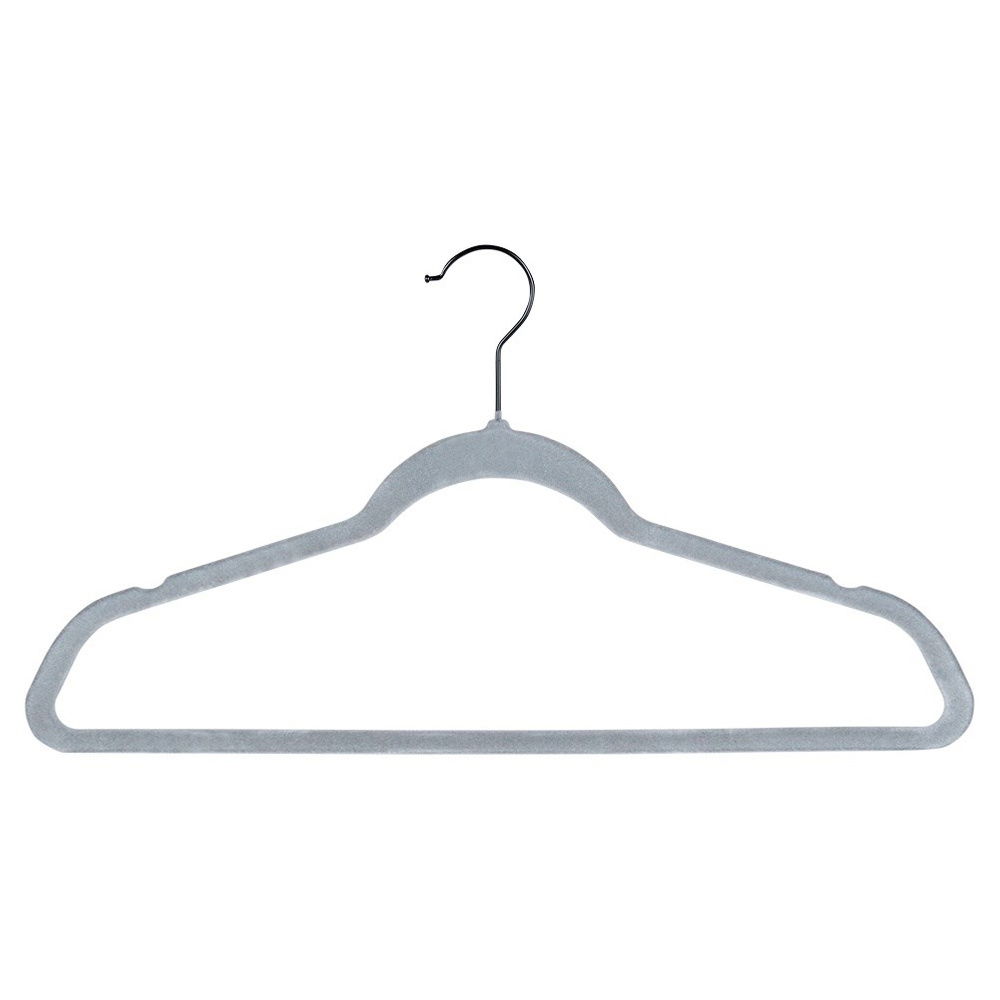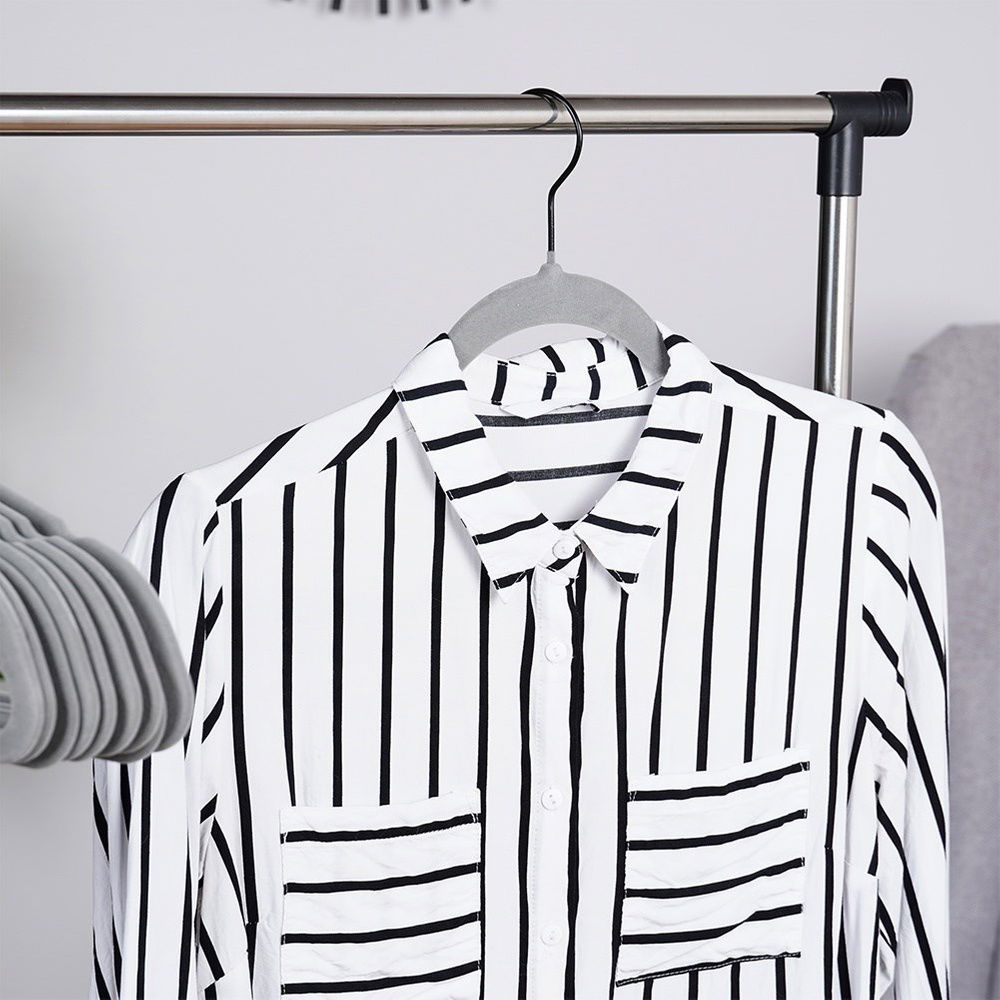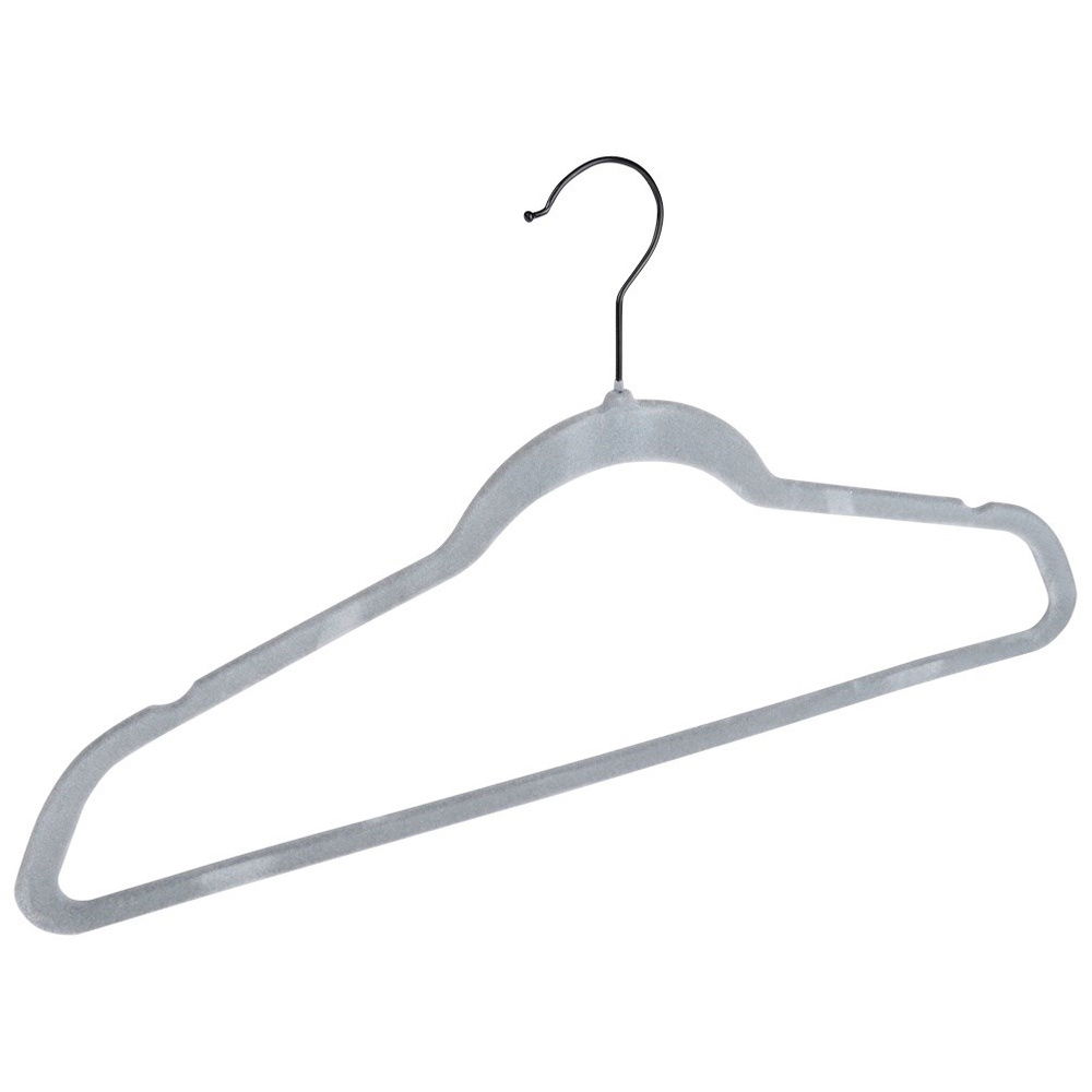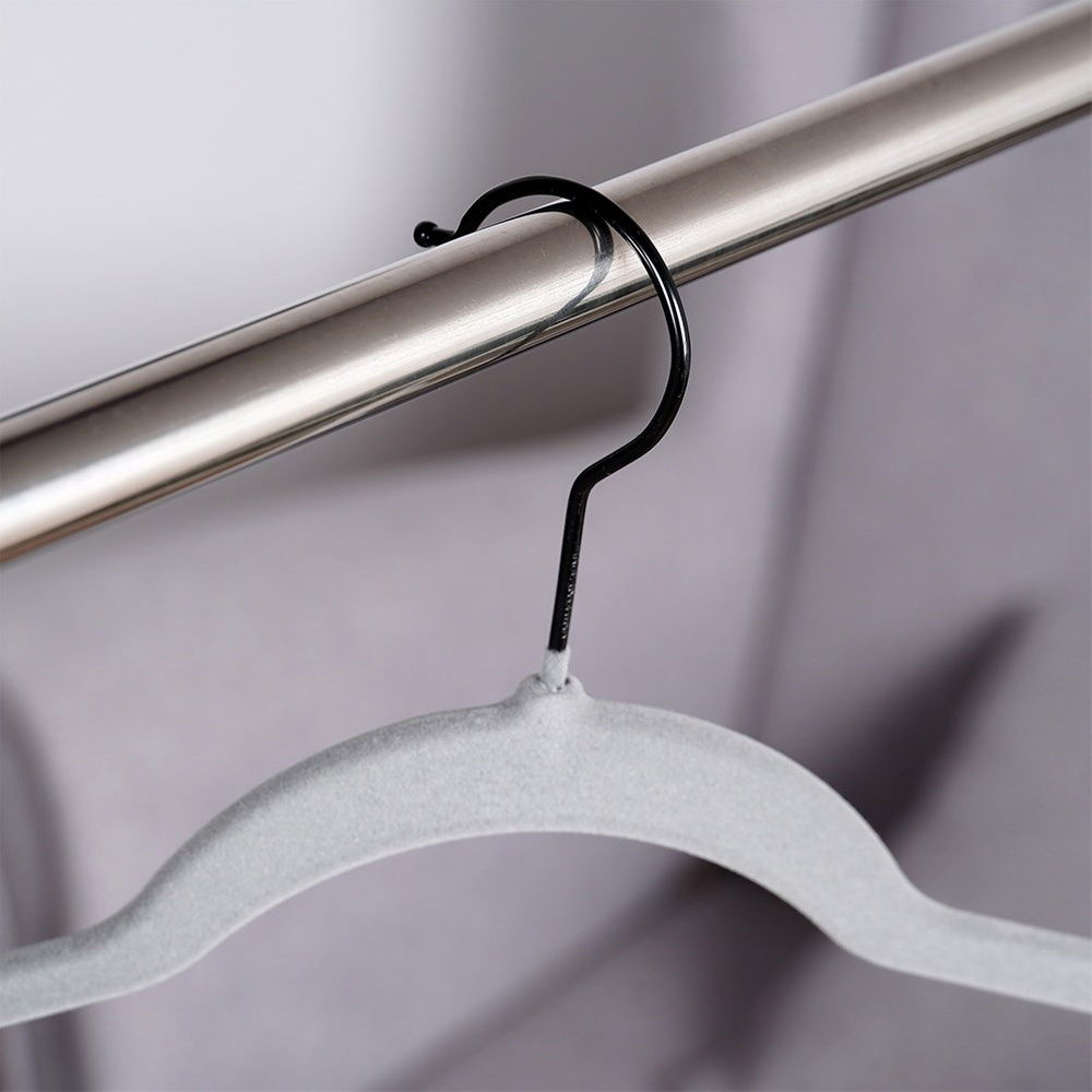 Antypoślizgowe, pokryte miękkim welurem - Wykonane z tworzywa, pokryte w całości mięciutkim welurem, który zapobiega zsuwaniu się ubrań. Welur jest delikatny dla tkanin, co jest szczególnie ważne przy przechowywaniu ubrań posiadających delikatne materiały. Posiadają metalowy haczyk w kolorze czarnym.