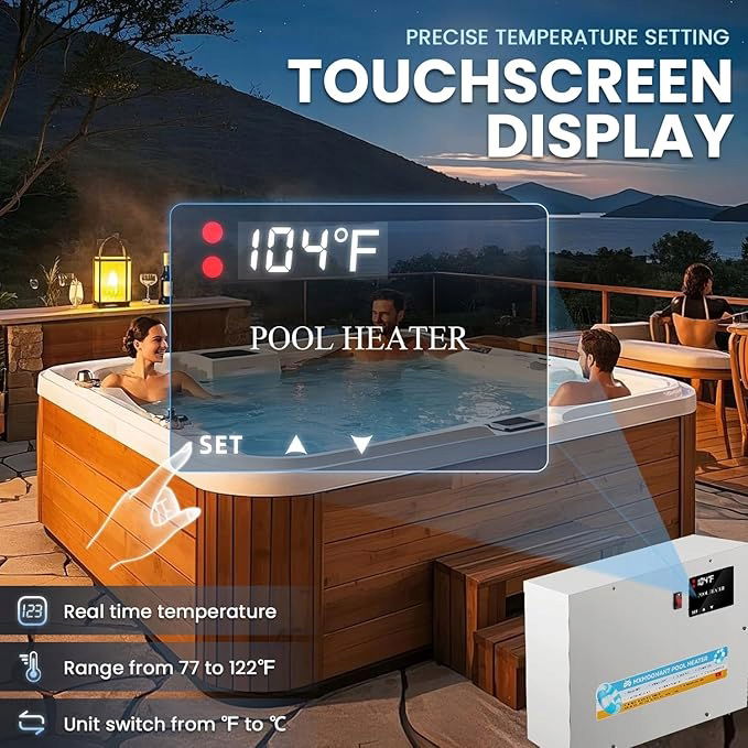 [Ekran dotykowy]: W porównaniu z tradycyjnymi pokrętłami do regulacji temperatury, ulepszony ekran dotykowy podgrzewacza basenowego o mocy 11 kW poprawia czytelność i kontrolę. Temperatura jest wyświetlana wizualnie, co pozwala na bardziej precyzyjną i łatwą regulację.