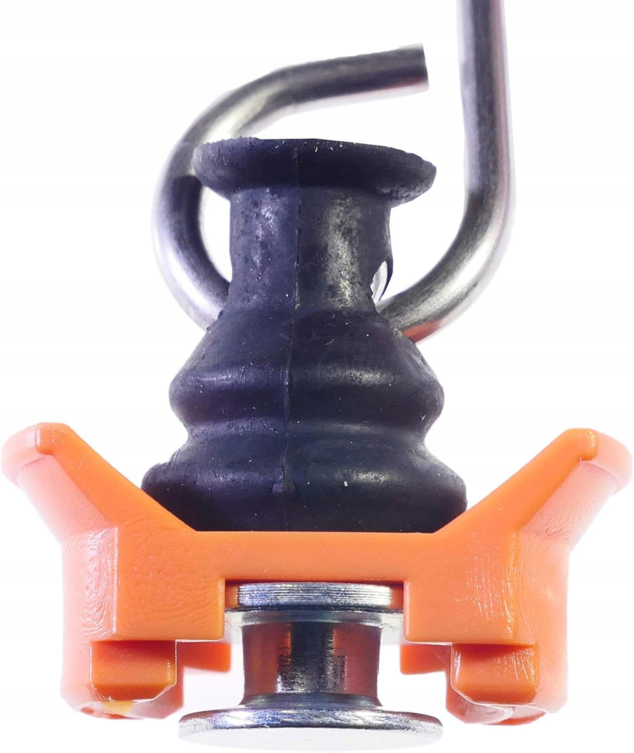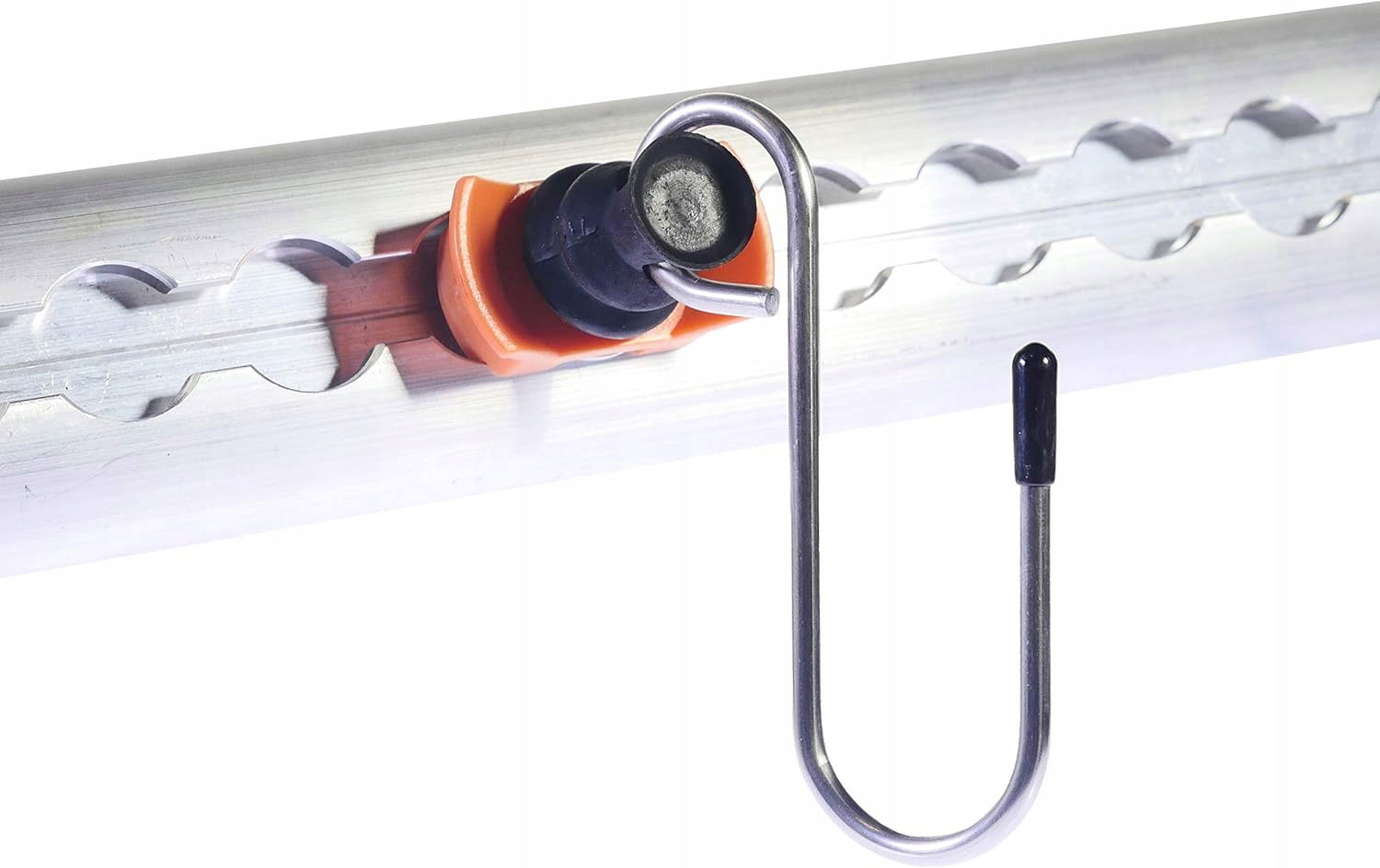 - Włożyć złączkę do szyny mocującej, zablokować poprzez zwolnienie sworznia sprężyną. Haczyki ze stali nierdzewnej.