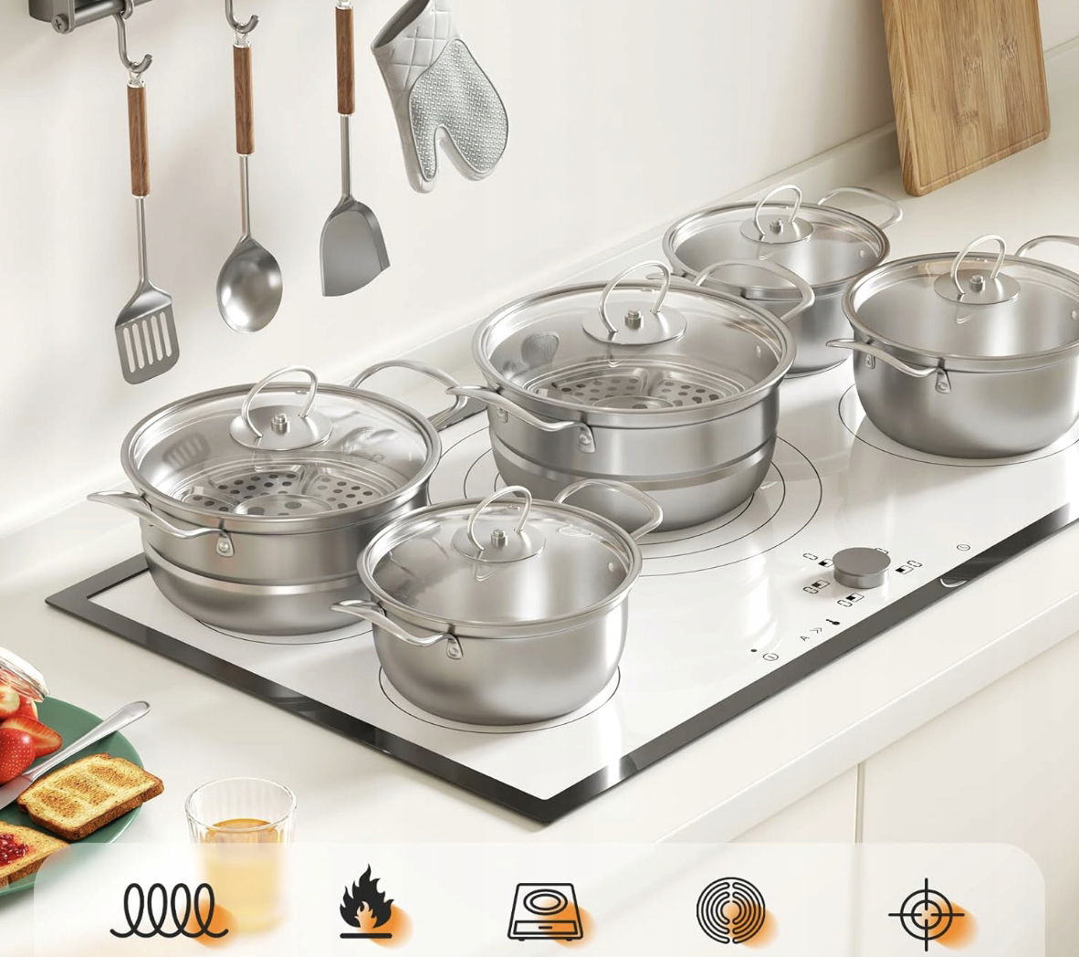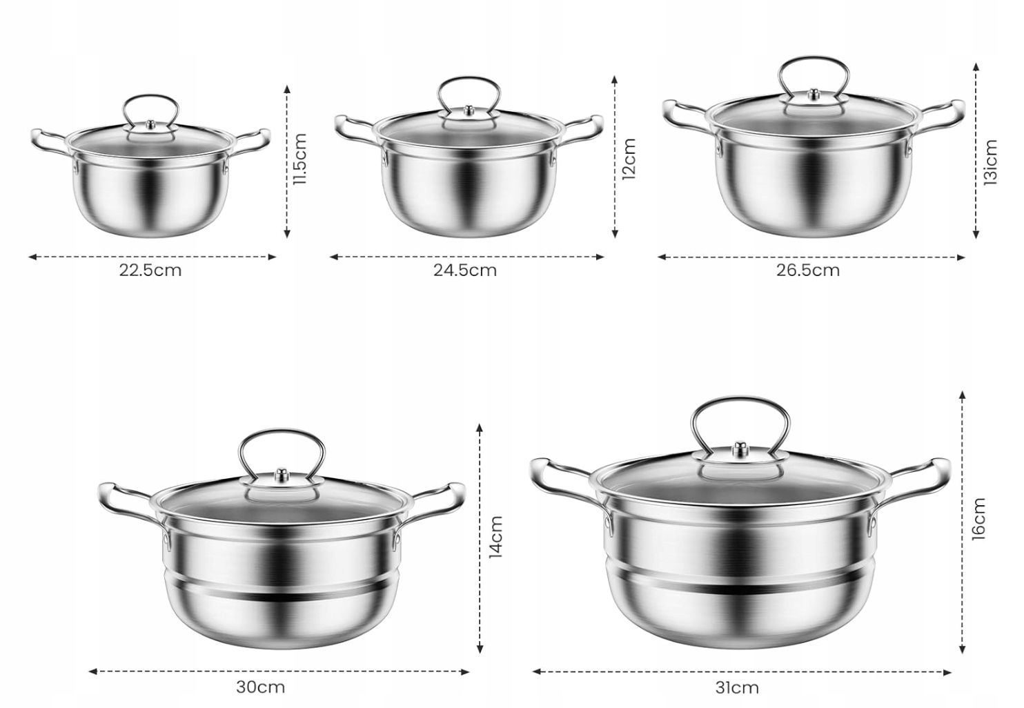 Wykonane ze stali nierdzewnej, z eleganckimi szklanymi pokrywkami, są odporne na uszkodzenia, łatwe w czyszczeniu i odpowiednie do wszystkich rodzajów kuchenek – w tym indukcyjnych.