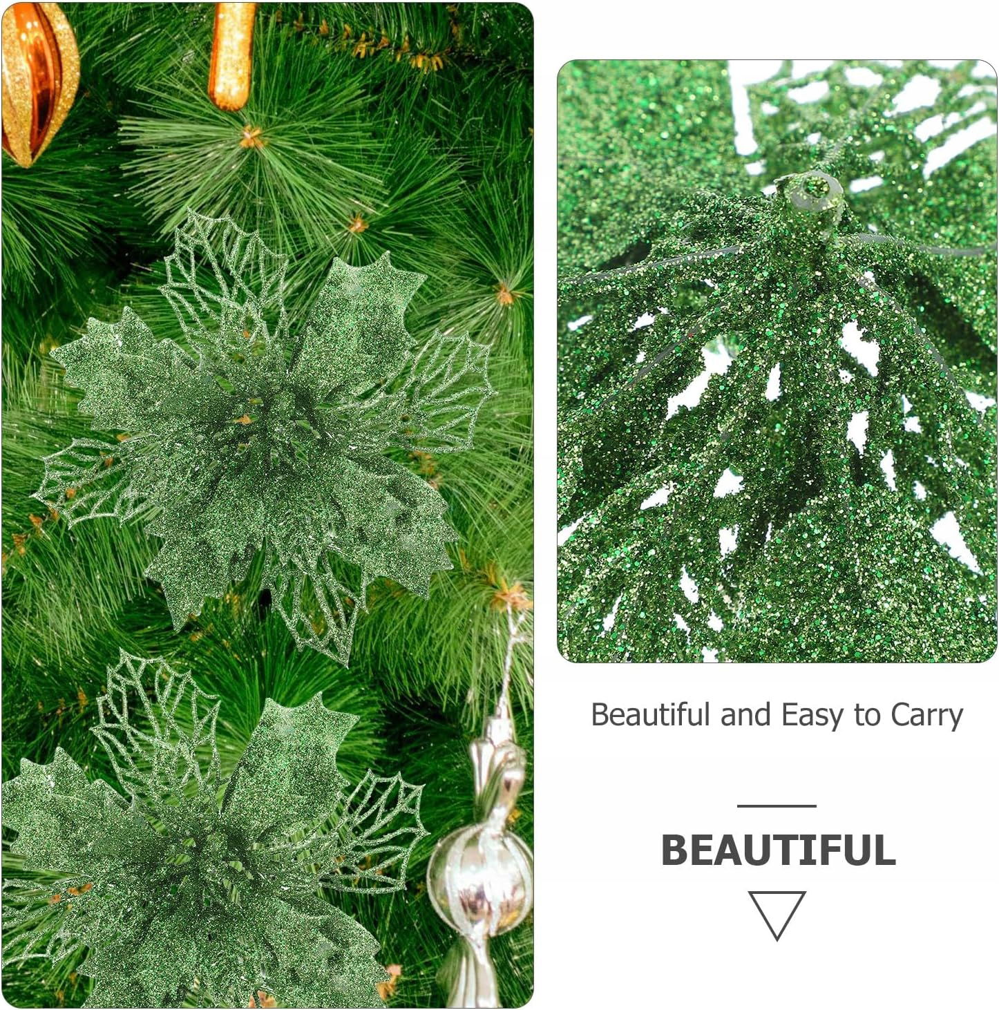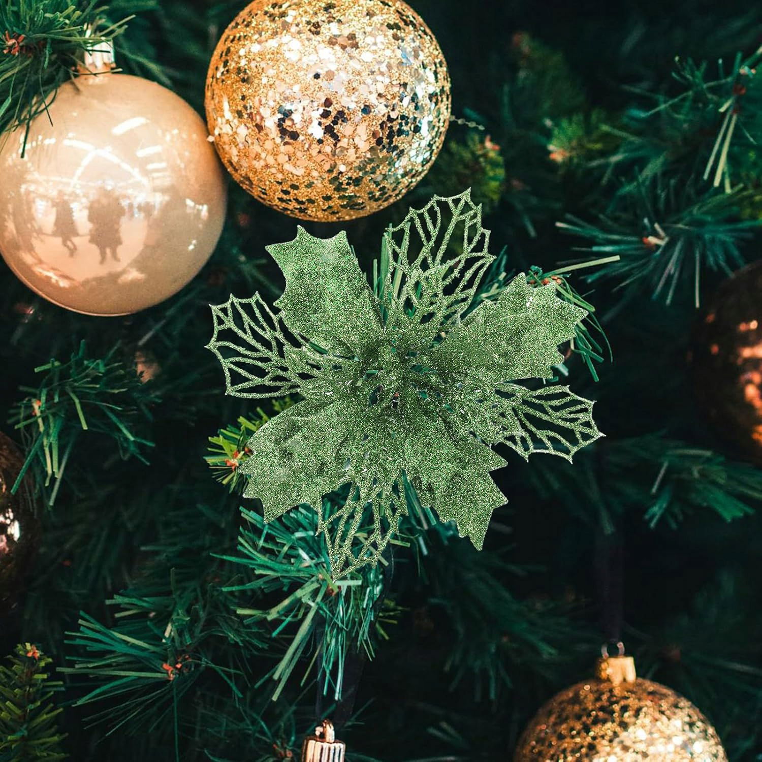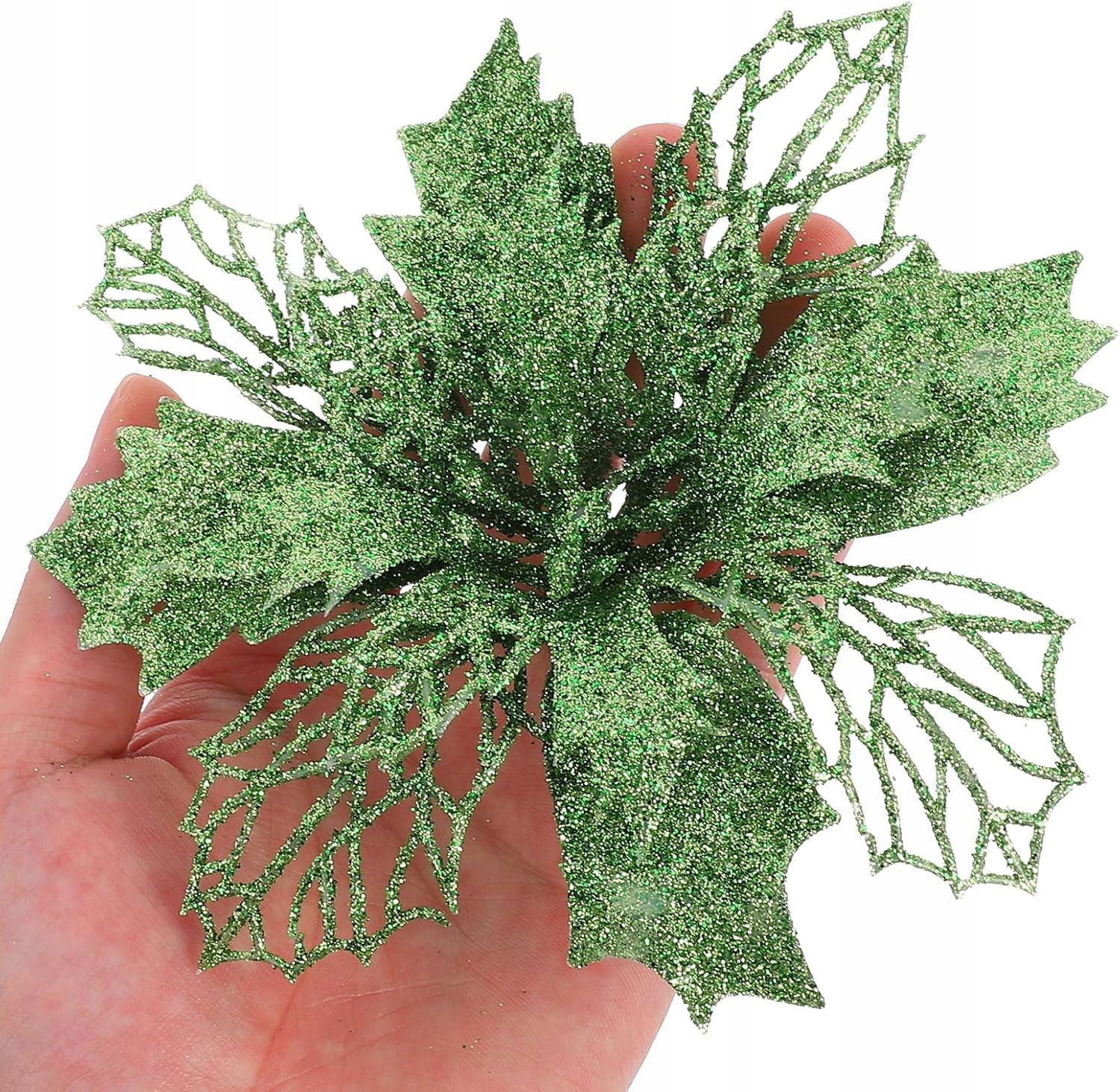 12 szt. brokatowych kwiatów poinsecji, sztuczne kwiaty świąteczne, puste kwiaty poinsecji do dekoracji stołu weselnego w girlandzie choinkowej (zielone)