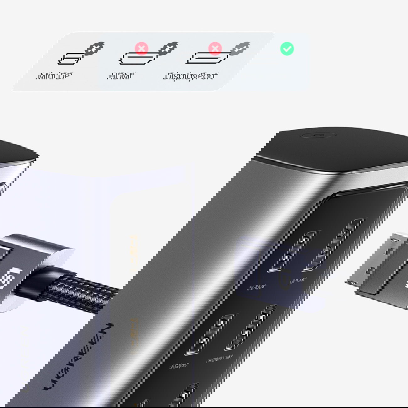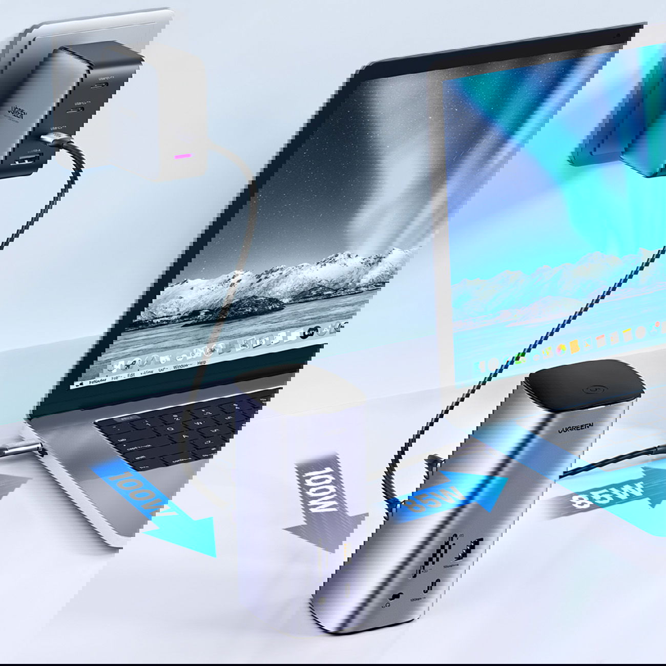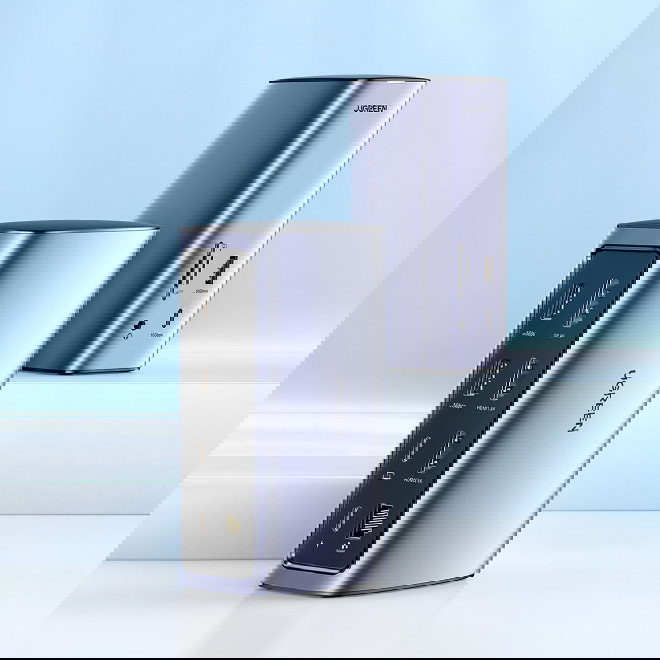 Kod produktu: 1019076Wielofunkcyjna stacja dokująca marki Ugreen to gadżet, który warto posiadać w swoim domu lub biurze. HUB zapewnia nam rozszerzenie obecnych portów w laptopie, komputerze o 12 nowych. Znacznie zwiększa to produktywność oraz wydajność w czasie pracy. Za jego pomocą m.in. podłączysz dodatkowy monitor, kabel sieciowy, kartę pamięci, słuchawki 3,5mm mini jack i inne urządzenia USB lub USB C. Został wykonany z wysokiej klasy stopu aluminium. Silikonowe podkładki skutecznie chronią biurko przed porysowanie, a także przypadkowym przemieszczaniem się urządzenia. Dzięki wbudowanym wyjściom wideo (HDMI 2.1 / HDMI 2.0 / DisplayPort 1.2) możesz wyświetlać obraz na dodatkowych monitorach w dwóch trybach - lustrzanym lub rozszerzania pulpitu. Zdecydowanie jest to niezbędny gadżet dla każdego użytkownika laptopa. Praca na laptopie, czy komputerze staje się wtedy przyjemnością.Duża ilość portówWspółczesne laptopy posiadają zbyt mało portów, aby obsłużyć wszystkie dodatkowe urządzenia, których potrzebujesz. Wielofunkcyjna stacja dokująca od Ugreen oferuje wsparcie użytkownika w każdym aspekcie dzięki 12 portom rozszerzeń takich jak USB C, USB, HDMI, DP, RJ45, AUX, SD, TF.Zasilanie przez port USB C PDHUB wyposażony jest w port USB C Power Delivery. Za jego pomocą możemy podłączyć zasilanie. Dzięki temu oszczędzasz drugi port USB w komputerze, który musiałby zostać zajęty przez zasilacz, żeby móc jednocześnie ładować baterię laptopa i korzystać z możliwości jakie daje HUB (urządzenie obsługuje zasilacze o mocy do 100W).Obraz najwyższej jakościPorty HDMI i Display port oferują najwyższą jakość rozdzielczości w 8K lub 4K i technologii 3D. Obraz jest odtwarzany płynnie, bez opóźnień, drgań, zacinania. Synchronizacja obrazu i dźwięku jest doskonała.Doskonała prędkość transmisji danychZ szybką transmisją do 10Gb/s na portach USB C, do 5Gb/s na portach USB i do 104 MB/s na gniazdach obsługujących karty SD/TF oferują Ci doskonałe prędkości przesyłania danych.Specyfikacja: