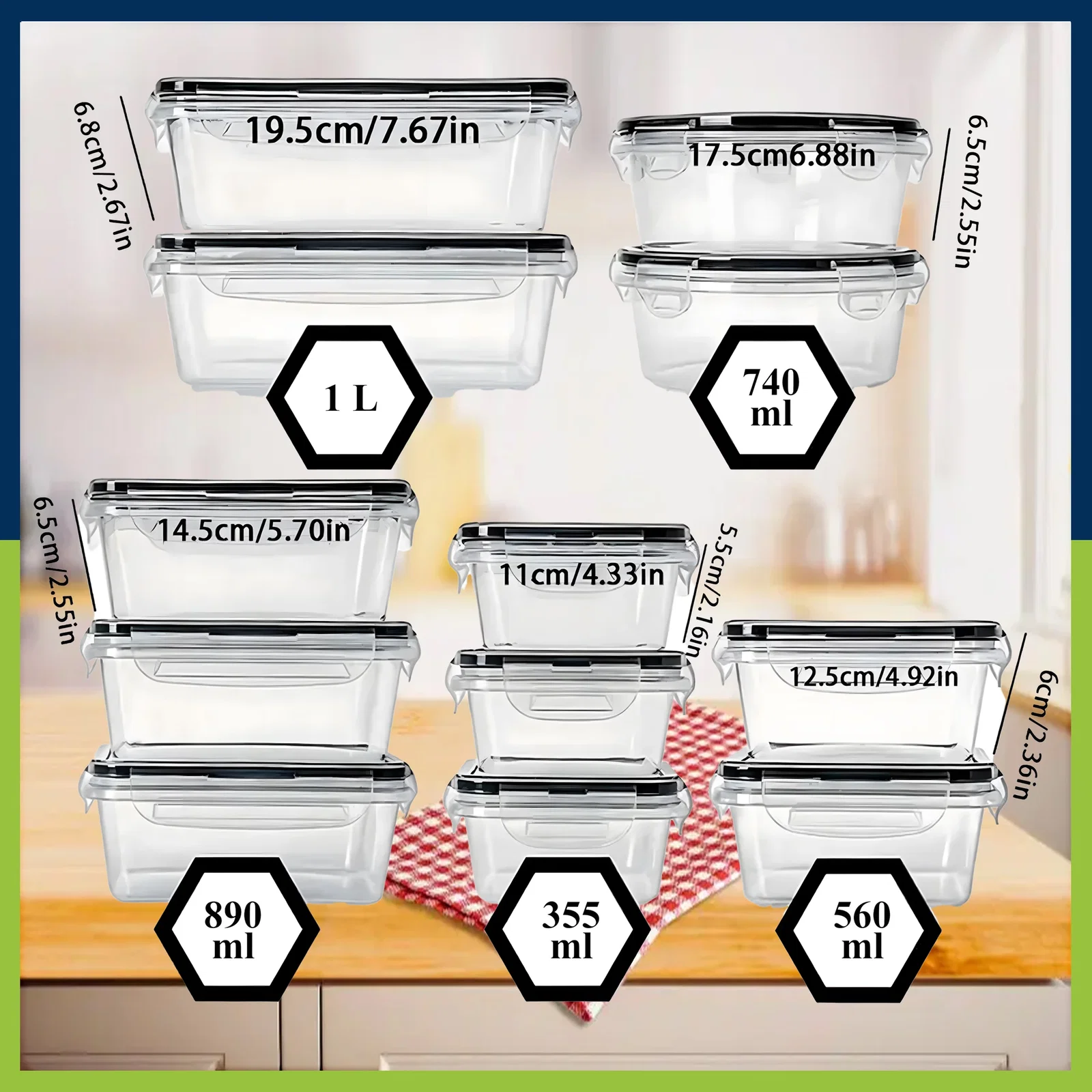 2x pojemnik o wymiarach 19,5 x 6,8 cm i pojemności 1000 ml, 3 x pojemnik o wymiarach 14,5 x 6,5 cm i pojemności 890 ml, 2 x pojemnik o wymiarach 17,5 x 13 x 6,5 cm i pojemności 740 ml, 2 x pojemnik o wymiarach 12,5 x 6 cm i pojemności 560 ml, 3 x duży pojemnik o wymiarach 11 x 5,5 cm i pojemności 355 ml,