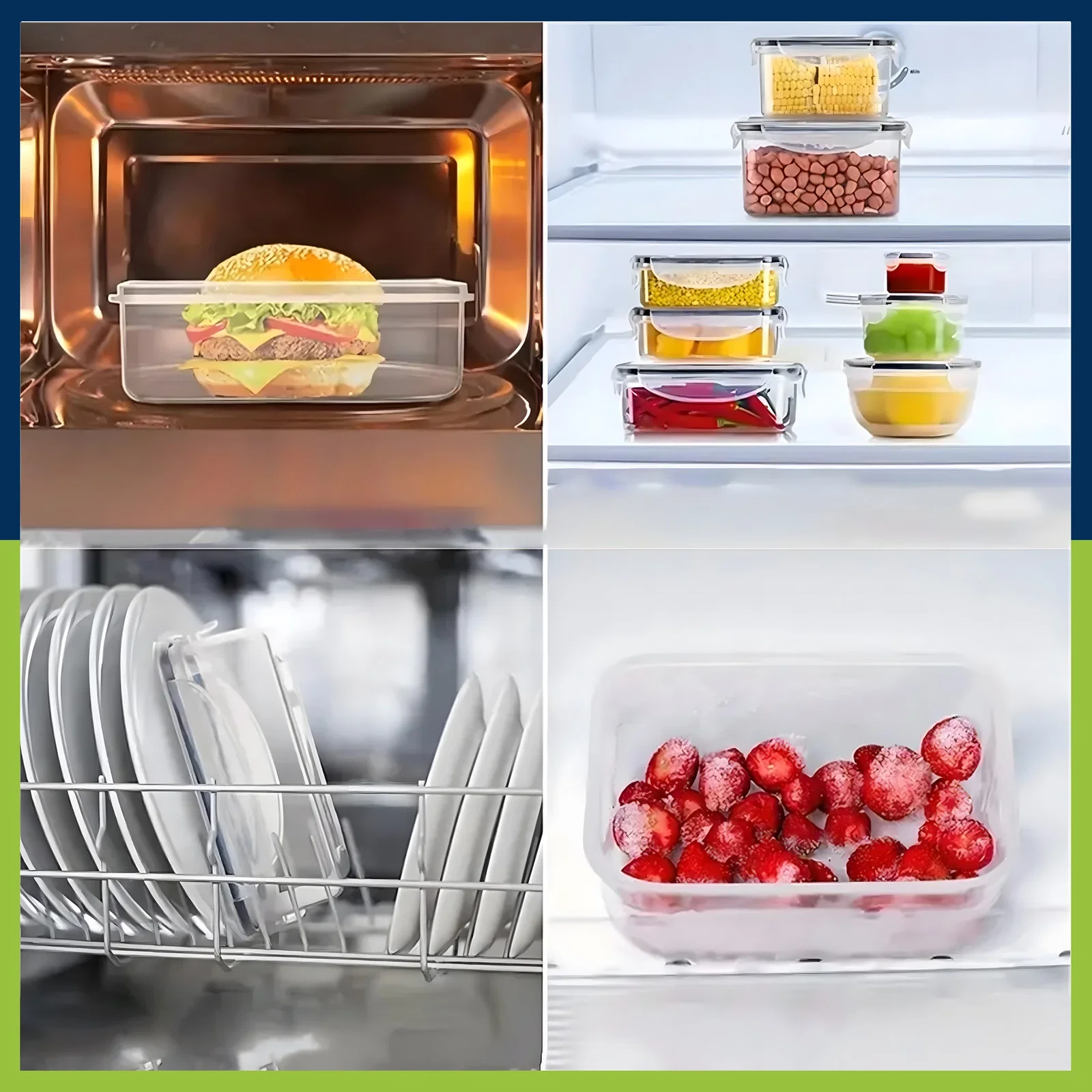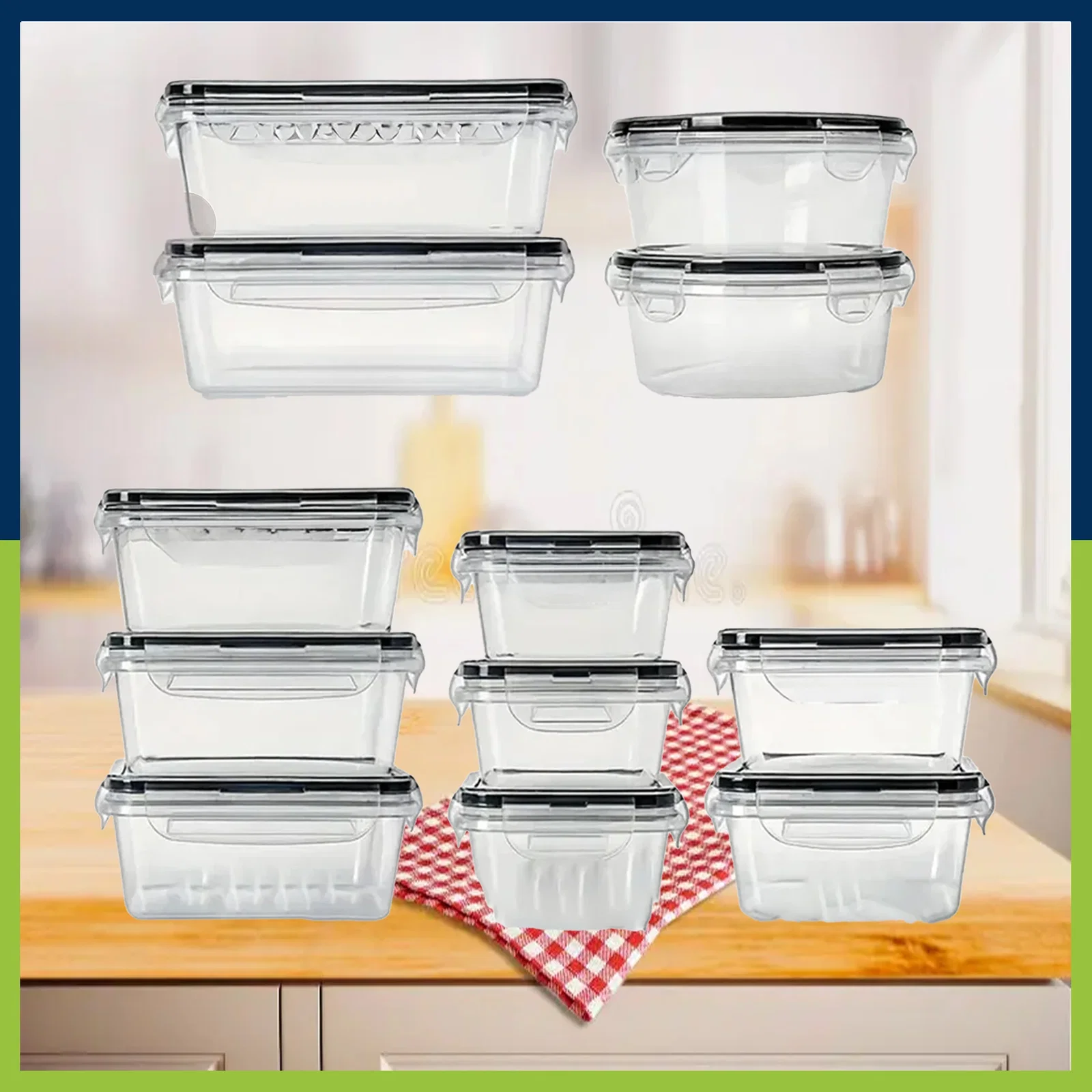 Zestaw zawiera różne rozmiary pojemników prostokątnych i okrągłych