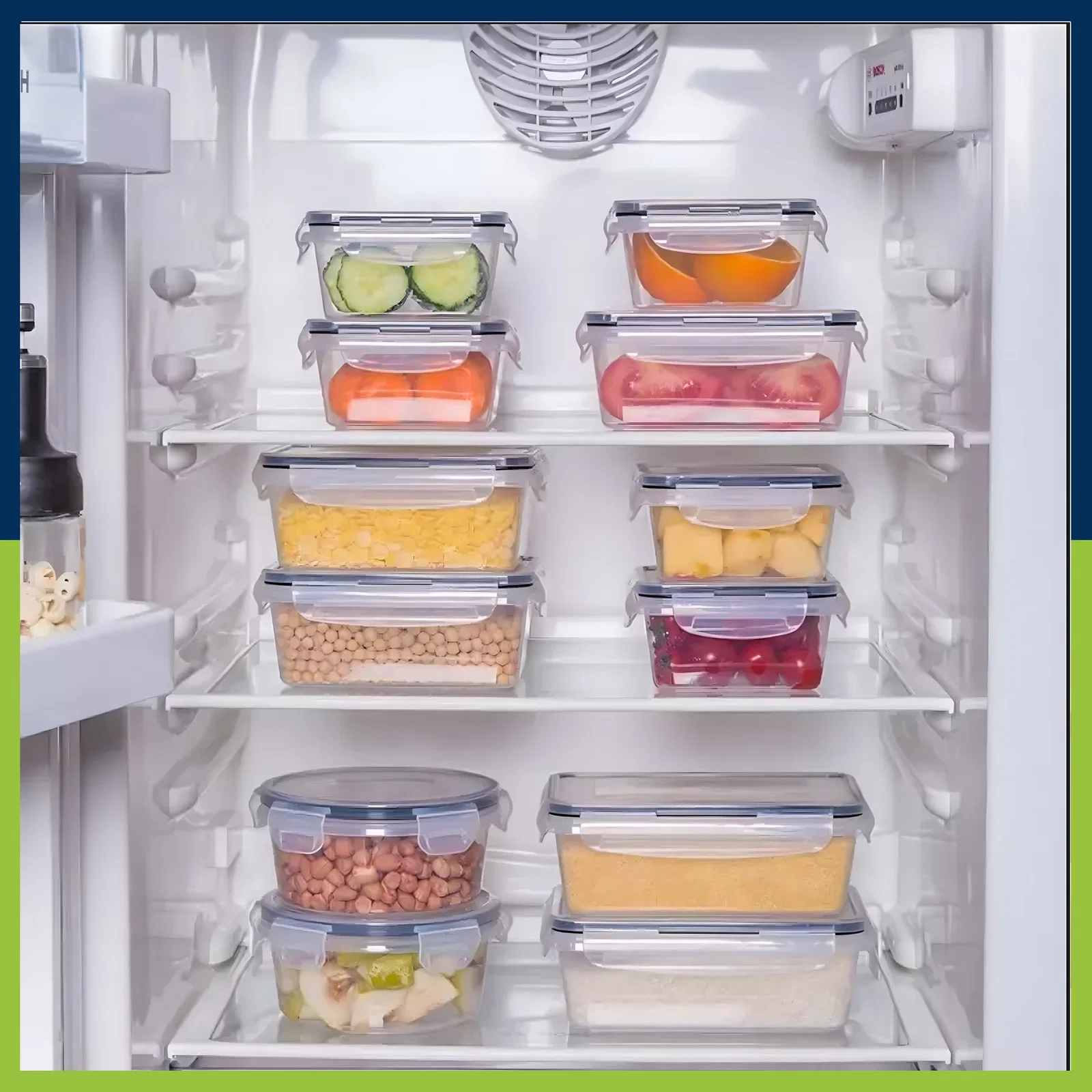Zestaw zawiera różnorodne pojemniki o różnych wielkościach, umożliwiające przechowywanie różnych ilości żywności.