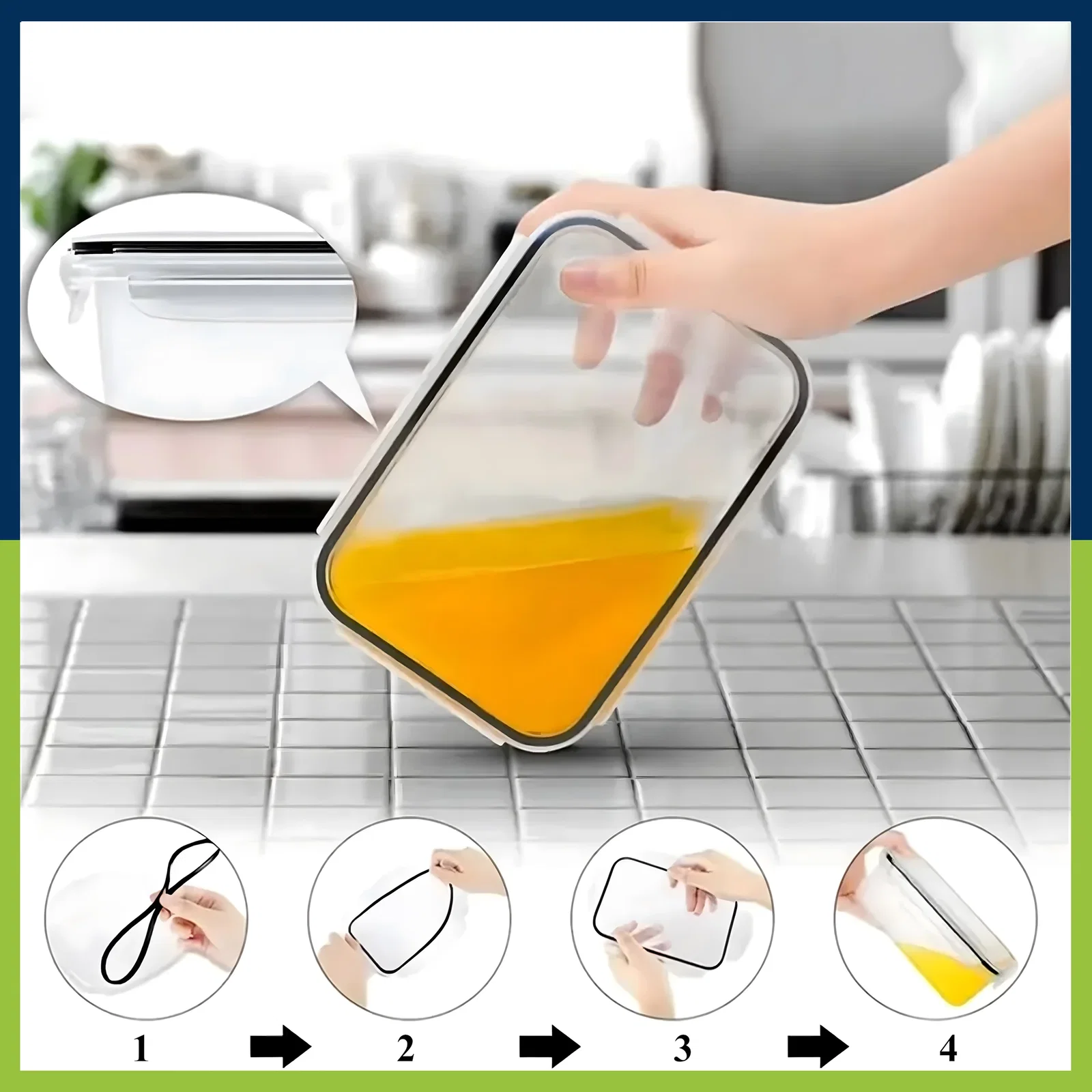 Każdy pojemnik wyposażony w uszczelniający silikonowy pasek i zamki pomiarowe, zapewniający świeżość przechowywanych produktów