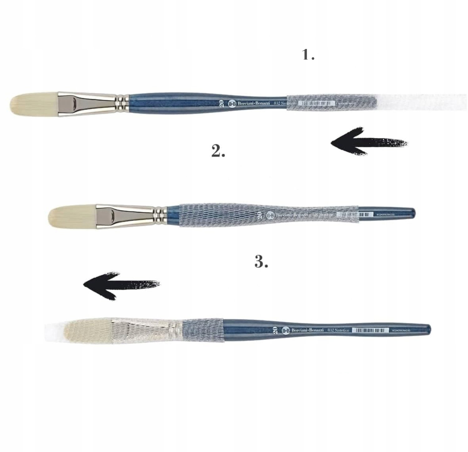 - Sposób użycia: pędzel wsuwa się do elastycznej siatki od dołu, co zapobiega uszkodzeniu włosia.