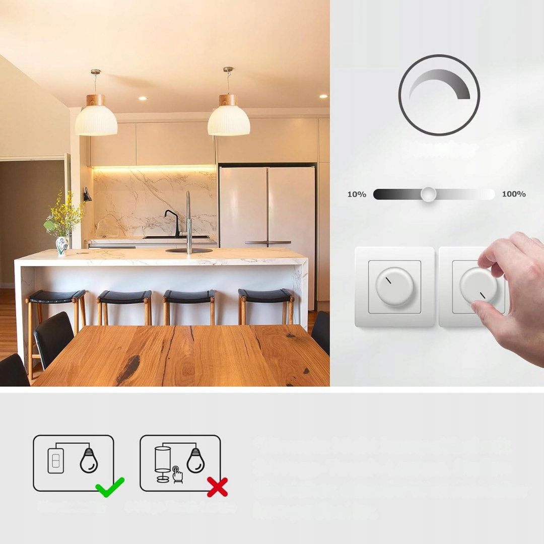 - Ciągła regulacja jasności: żarówka umożliwia płynne ściemnianie w zakresie od 10% do 100%, przy czym współpracuje z większością ściennych ściemniaczy. Nie nadaje się do lamp nocnych z ustalonymi poziomami jasności. Nie zawiera ołowiu ani rtęci, brak promieniowania UV.