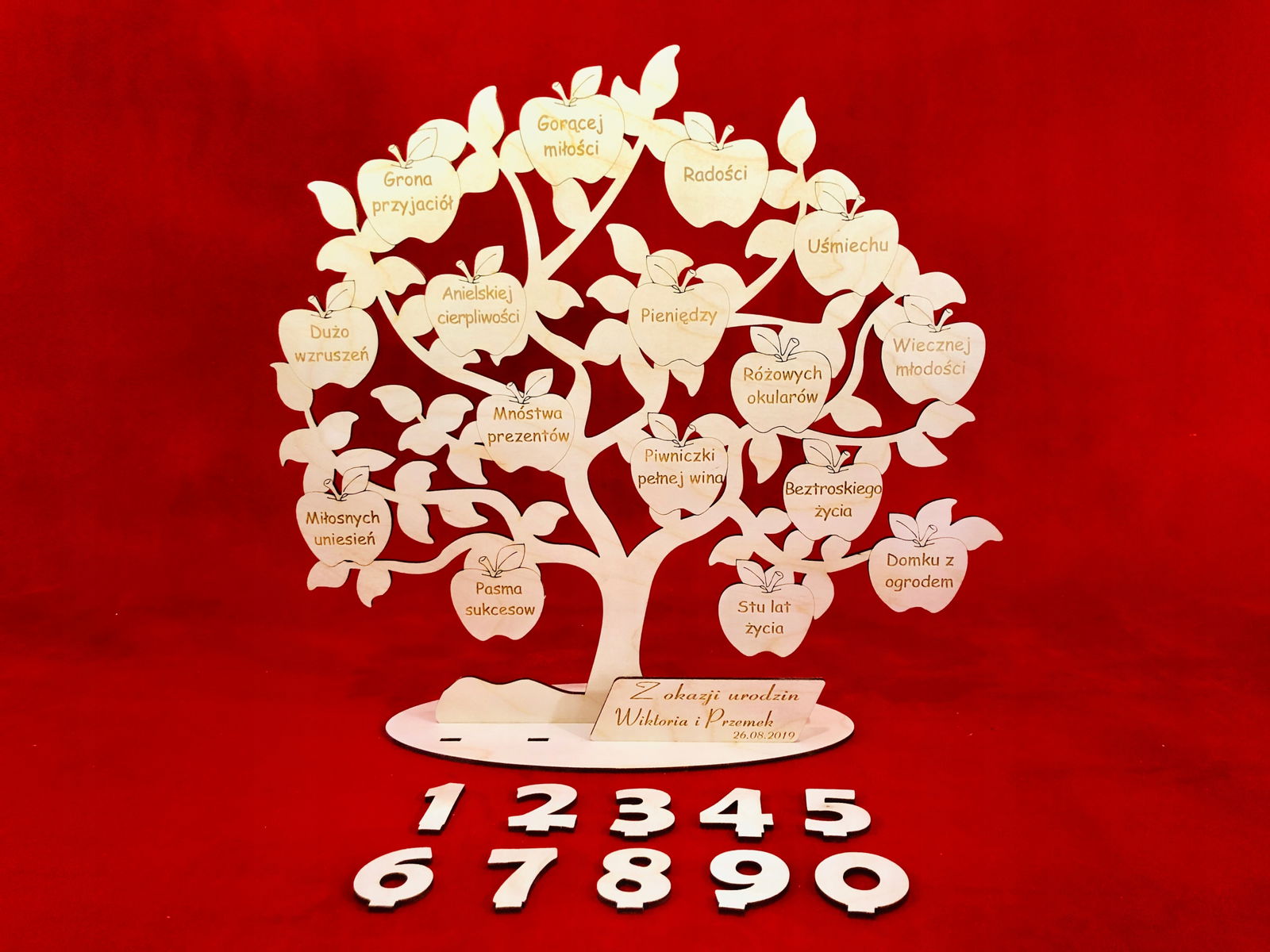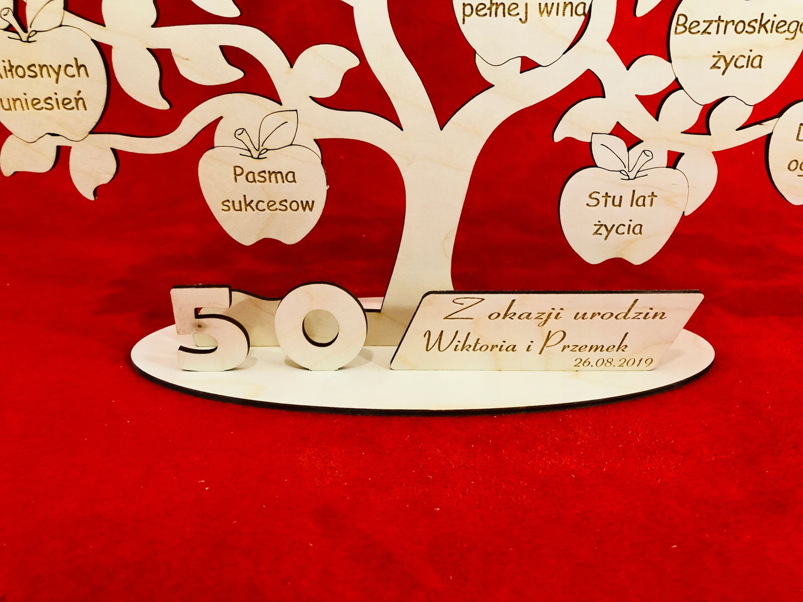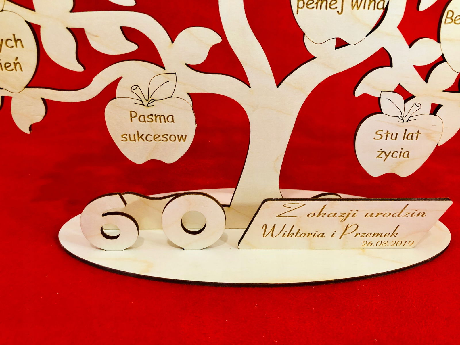 Przepięknie wycięte ze sklejki i grawerowane drzewko z życzeniami dla solenizanta.