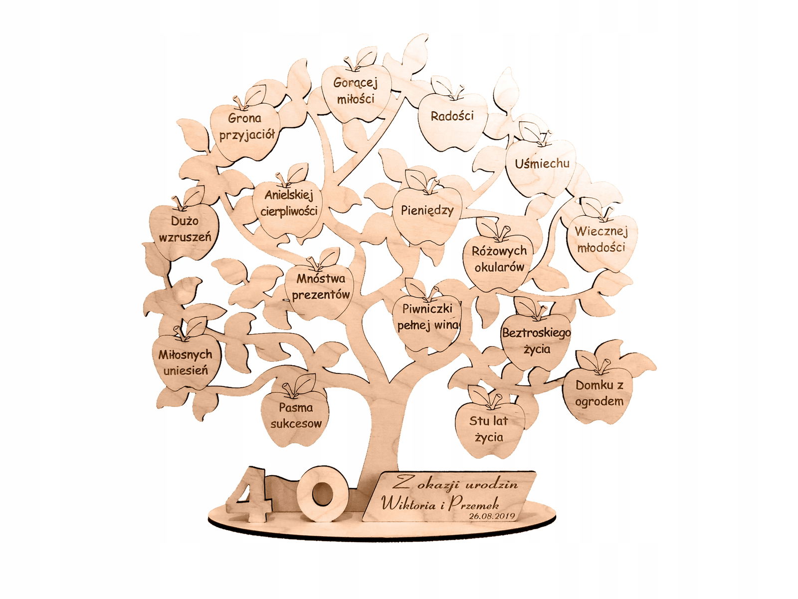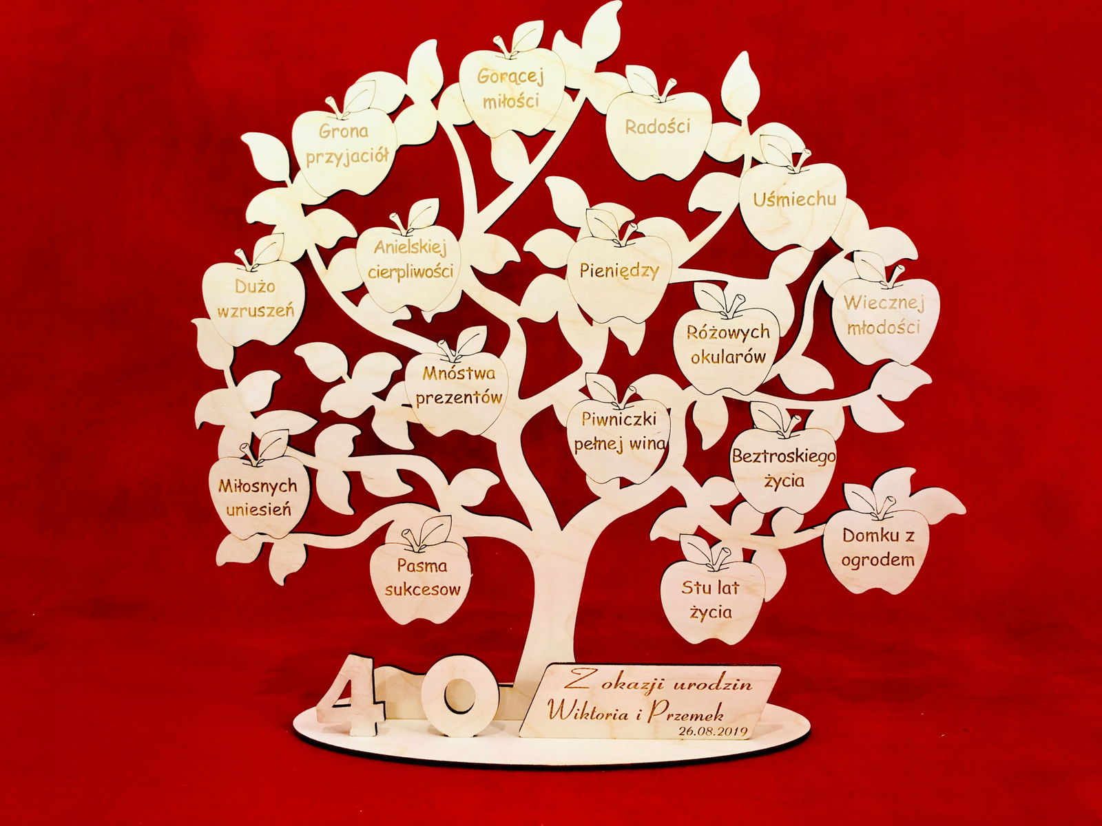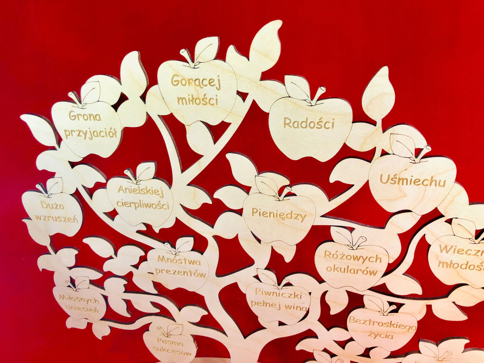 Przepięknie wycięte ze sklejki i grawerowane drzewko z życzeniami dla solenizanta.