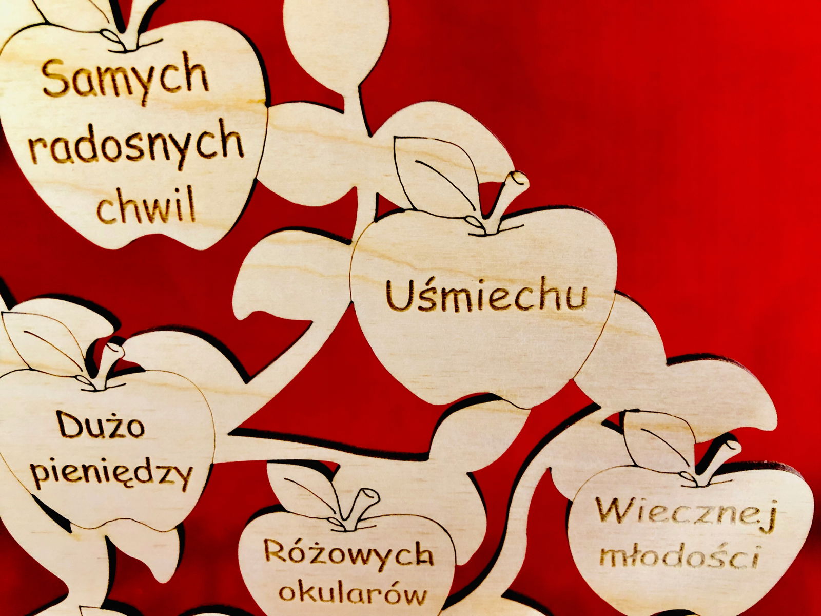 Prezent na urodziny w formie grawerowanego drzewka z życzeniami autorstwa naszej autorskiej pracowni grawerskiej GRAWERNIADDZ.