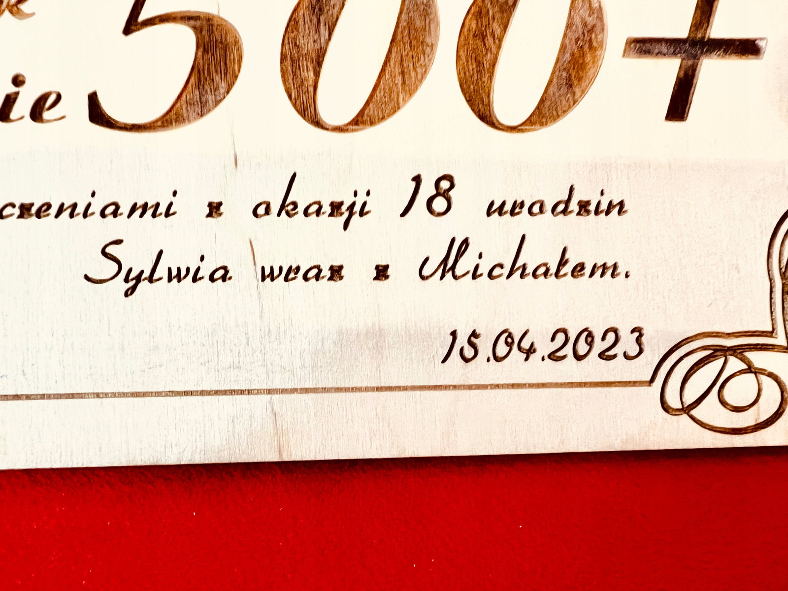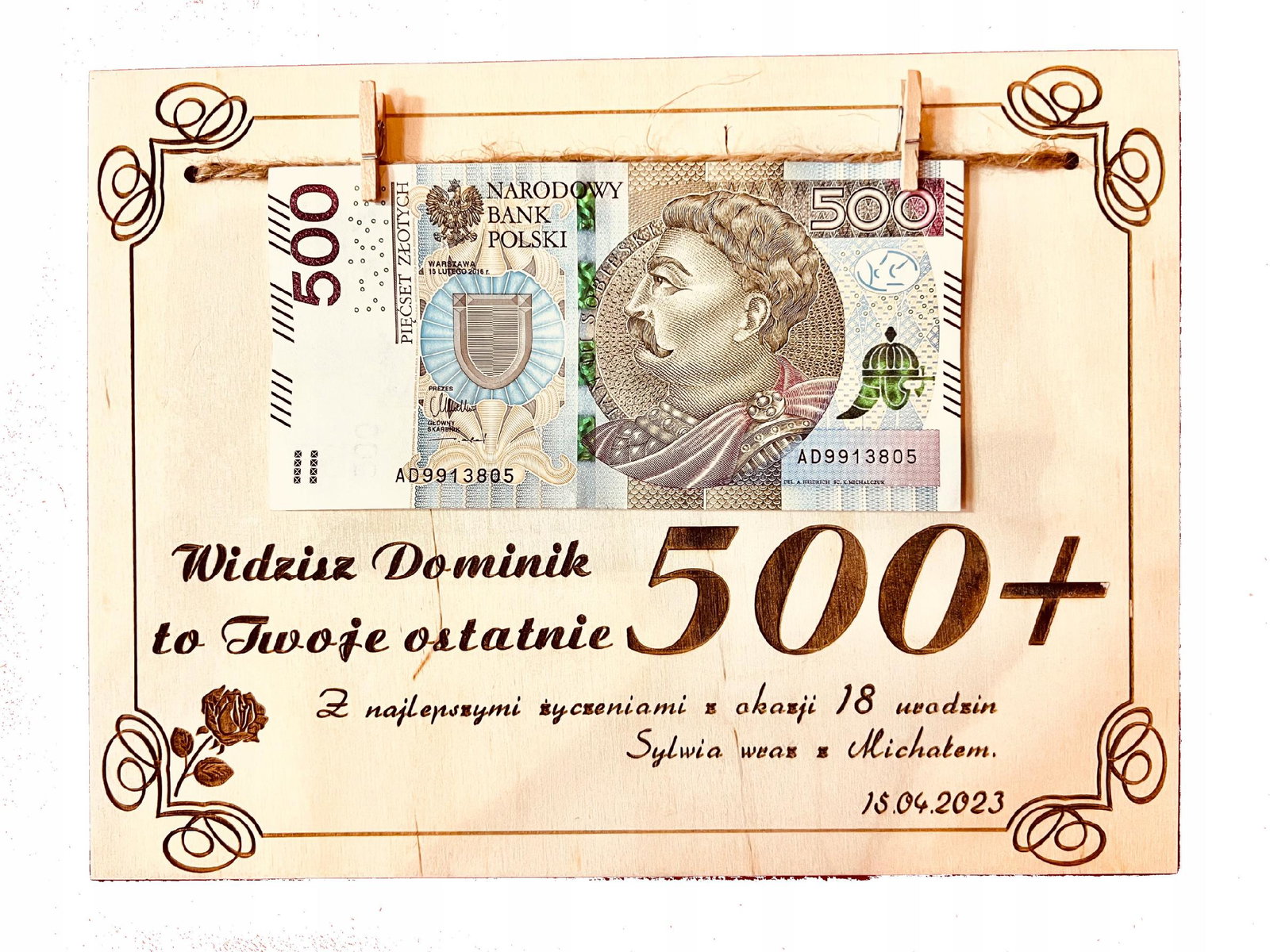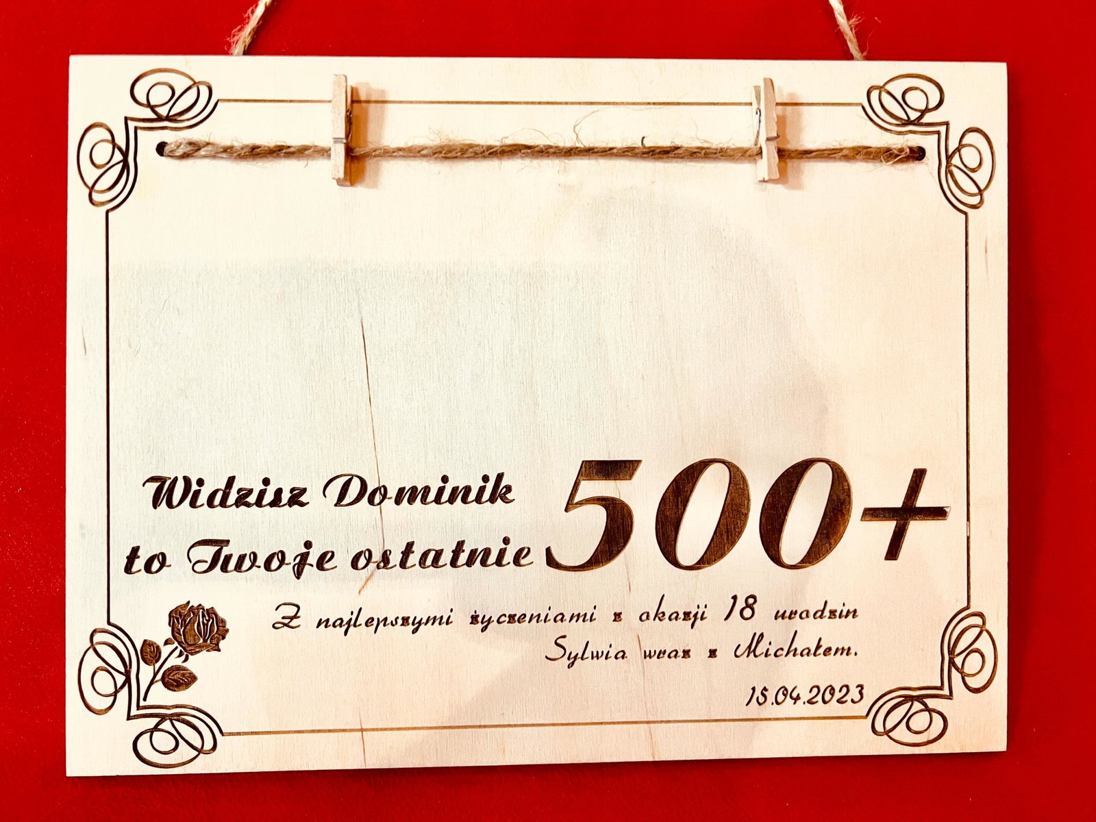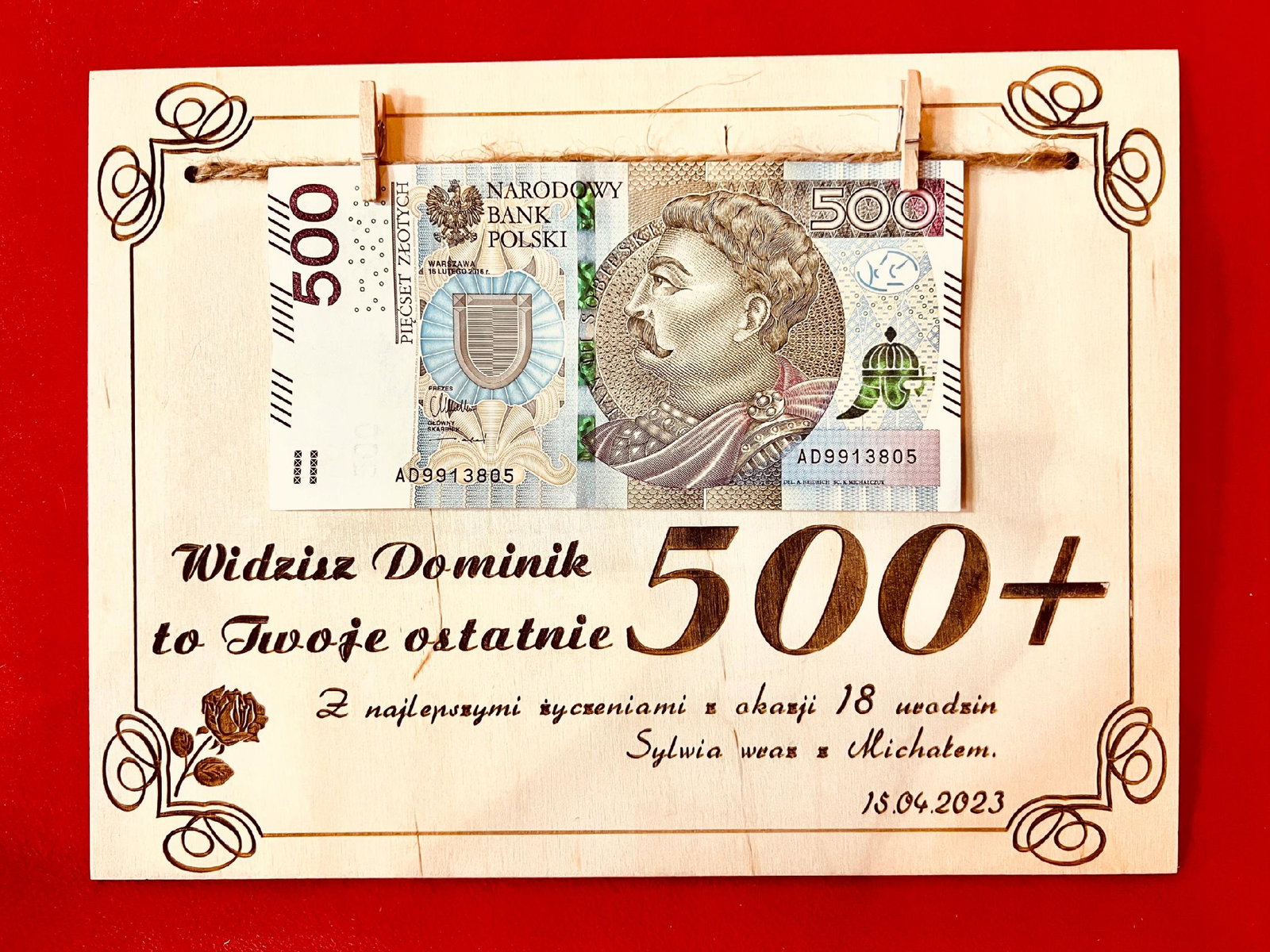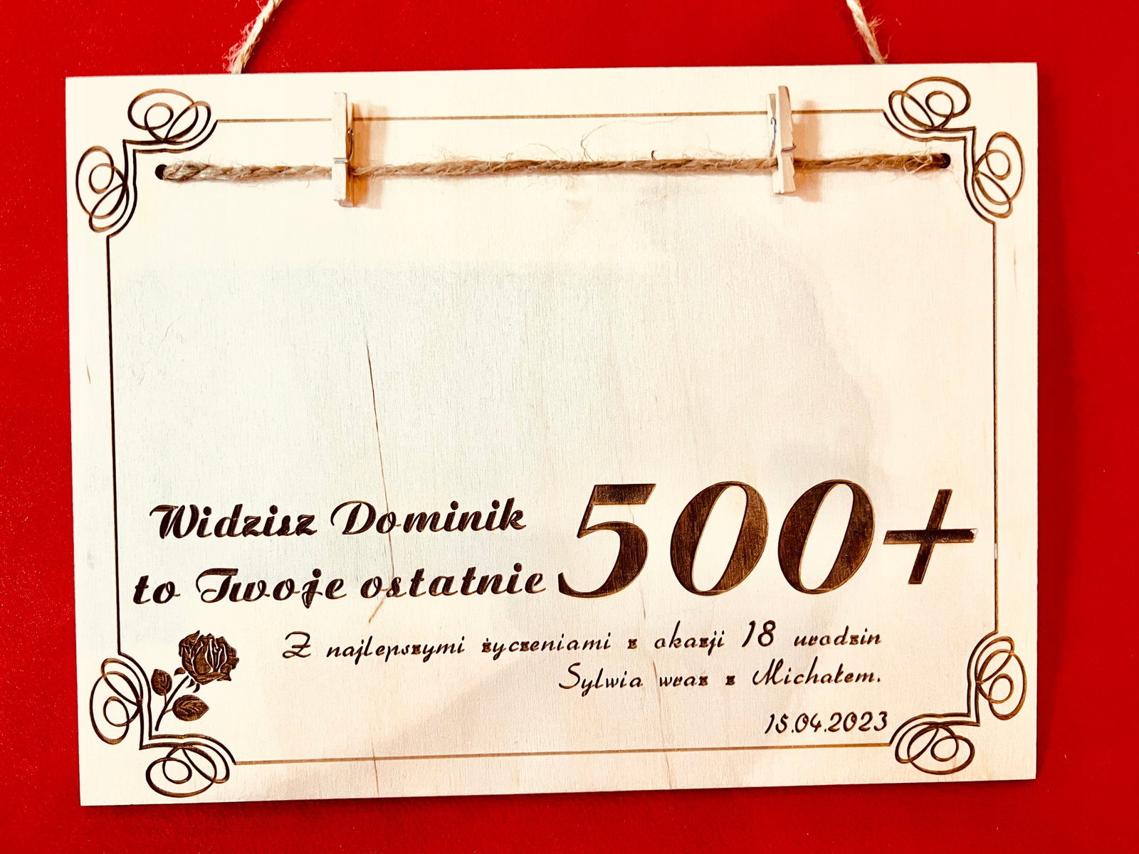Z okazji 18 urodzin to Twoje ostatnie 500+... Zamiast wręczać pieniądze w kopercie z kartką, co jest oklepane i banalnie proste a znając życie to kartka wcześniej lub później wyląduje w koszu, możesz podarować perfekcyjnie wykonaną drewnianą ramkę z pięknym grawerem i przyczepić banknoty zawieszone na sznureczku za pomocą klamerek które są w zestawie. Dodatkowo grawerujemy imię jubilata oraz od kogo jest prezent. Pełna personalizacja.
