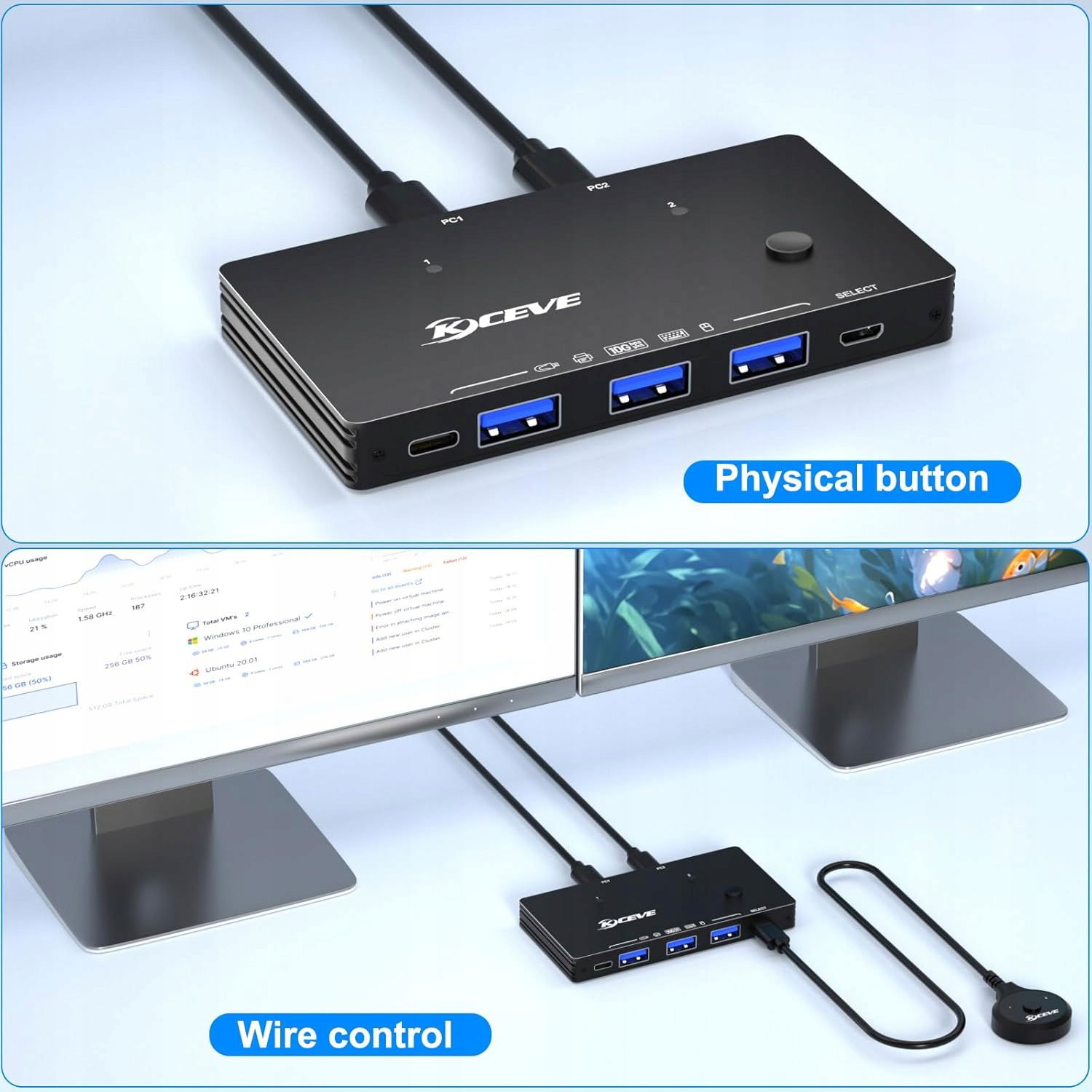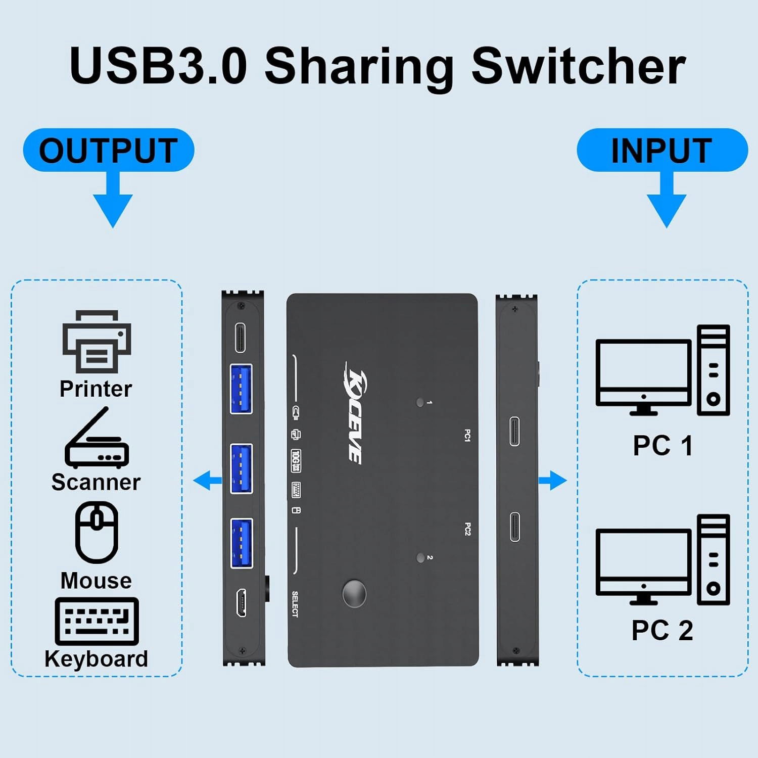 Jednym kliknięciem przełączasz jeden zestaw peryferiów między dwoma komputerami. KCEVE USB 3.0 pozwala dwóm PC/laptopom z USB-C współdzielić do 4 urządzeń USB (drukarka, skaner, klawiatura, mysz, pendrive, dysk). Działa „plug and play”, bez sterowników – przełączasz przyciskiem na obudowie albo przewodowym pilotem. Przepustowość USB 3.0 5 Gb/s zapewnia szybkie działanie akcesoriów. Urządzenie jest zasilane z magistrali; dla bardziej prądożernych zestawów możesz podać dodatkowe 5 V przez gniazdo zasilania USB-C. (To przełącznik USB danych, nie udostępnia obrazu – nie służy do monitorów).