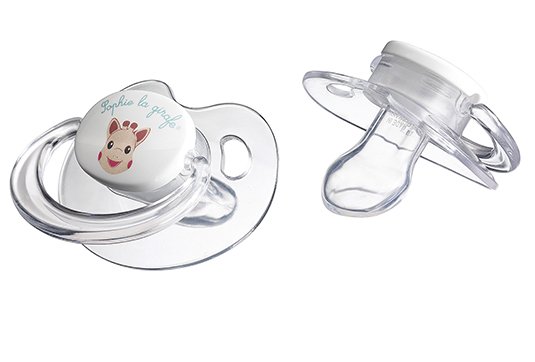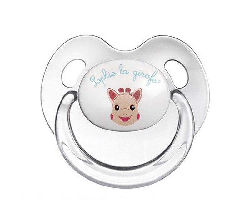 2 śliczne, silikonowe smoczki z wizerunkiem Żyrafy Sophie. Dwa otwory pozwalają na wentylację przy zasysaniu smoczka i zmniejszają powstawanie podrażnień.