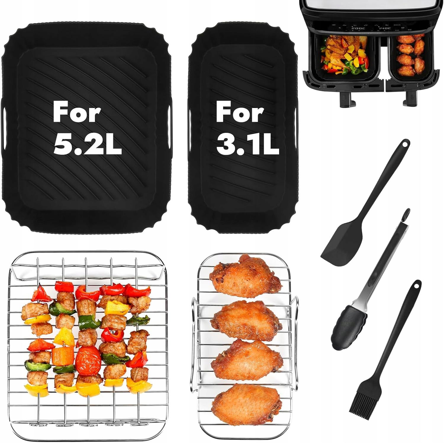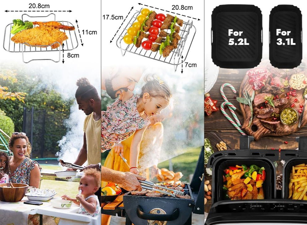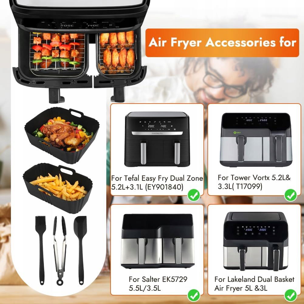 Akcesoria do frytkownicy powietrznej Dual Air Fryer to idealne rozwiązanie dla każdego miłośnika chrupiących potraw. Zestaw zawiera silikonową formę i ruszt do grilla. Dzięki nim przygotujesz smaczne dania bez nadmiaru tłuszczu.