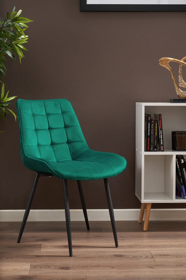 Aksamitna tapicerka uszyta z welurowej tkaniny wygląda niezwykle delikatnie, a wysokie i smukłe nóżki w czarnym kolorze wyglądają bardzo szykownie oraz gwarantują idealną stabilność.