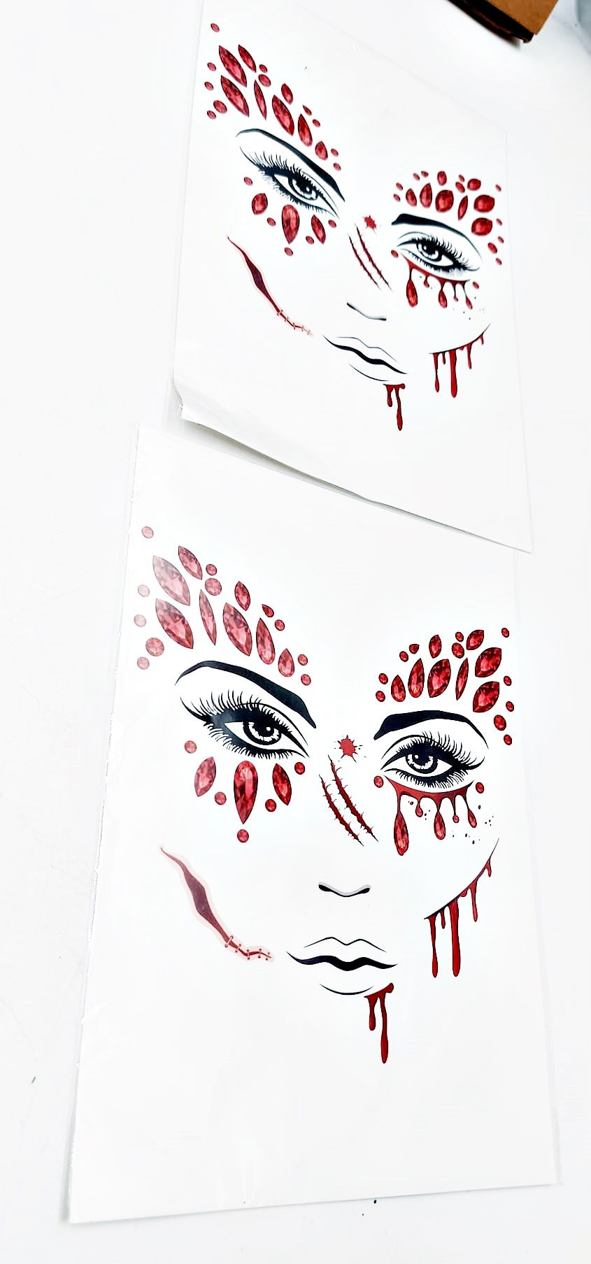 💀 Naklejki na twarz: Wzór czerwonych łez z detalami, które doskonale uzupełnią Twój upiorny makijaż.