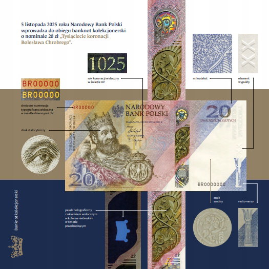 Narodowy Bank Polski (NBP) wyemituje kolekcjonerski banknot 20 zł z okazji tysiąclecia koronacji Bolesława Chrobrego. Banknot ma zostać wprowadzony do obiegu 5 listopada 2025 roku i jest częścią serii emisji upamiętniających ważne wydarzenia w historii Polski.