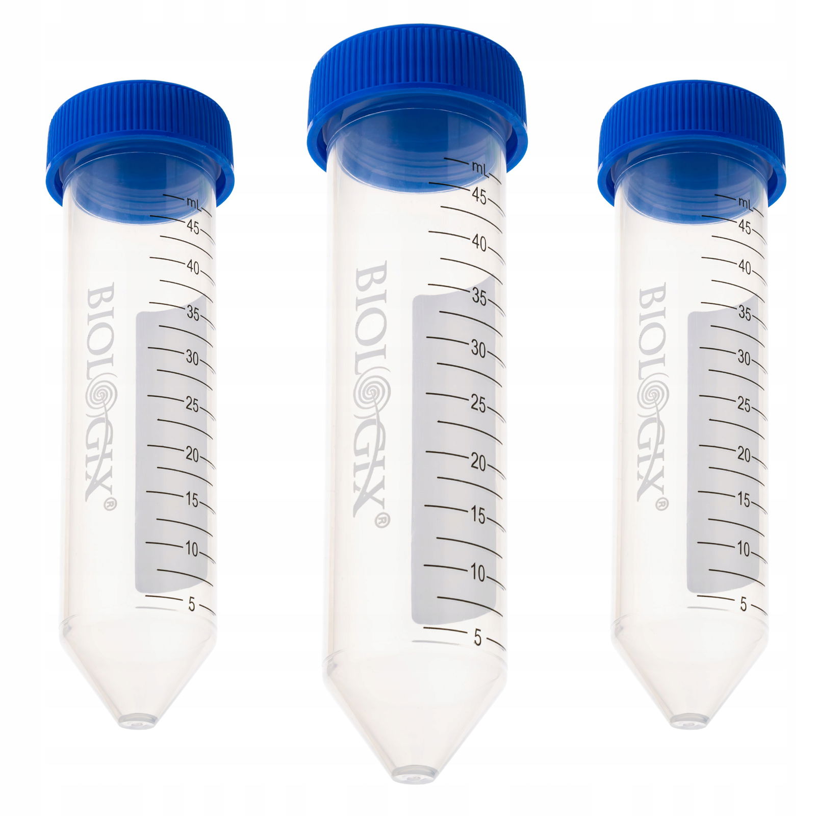 Sterylne probówki wirówkowe typu Falcon o pojemności 50 ml, wykonane z polipropylenu (PP). Dzięki stożkowemu zakończeniu możliwe jest precyzyjne opróżnianie zawartości. Na przezroczystych ściankach znajduje się białą podziałka co 2,5 ml oraz duże pole opisowe o wymiarach 55 × 18 mm. Probówki pakowane są po 25 sztuk w hermetyczne worki i wyposażone w płaskie zakrętki z polietylenu (PE), umożliwiające dodatkowe oznaczenie próbki.