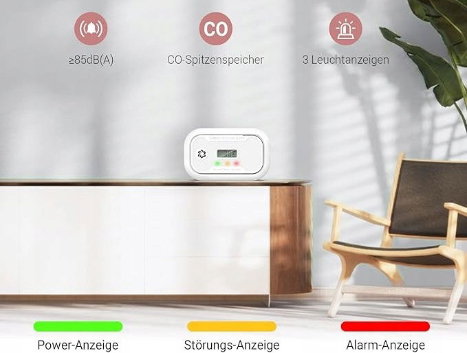 Zaawansowany czujnik CO: Czujnik CO jest wyposażony w elektrochemiczny czujnik tlenku węgla, który szybko i precyzyjnie wykrywa niebezpieczne stężenia CO od 23 ppm do 999 ppm i emituje dźwięk alarmu powyżej 85 db, aby ostrzec Cię tak wcześnie, jak to możliwe.