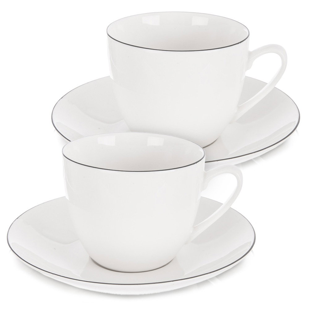Wykonane z porcelany - Wykonane z najwyższej jakości porcelany w białym kolorze. Delikatne wykończenie w postaci cienkiej czarnej obwódki podkreśla elegancki charakter filiżanek i spodka i nadaje mu ponadczasowy wygląd. Delikatne wykończenie w postaci cienkiej czarnej obwódki podkreśla elegancki charakter talerza i nadaje mu ponadczasowy wygląd.