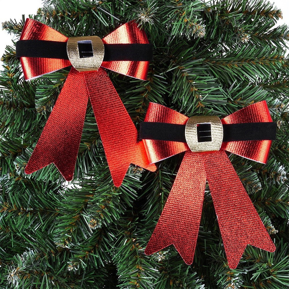 Efektowny wygląd - Kokardy wykonane z tworzywa w czerwonym, błyszczącym kolorze. Posiadają ozdobny, czarny pasek wykonany z weluru z imitacją złotej klamry, co dodaje elegancji i nawiązuje do klasycznego, świątecznego stylu.