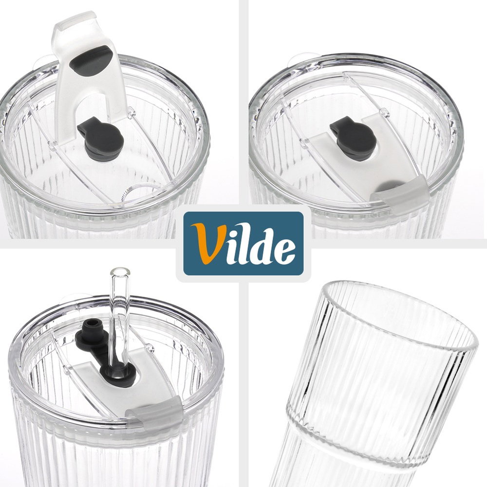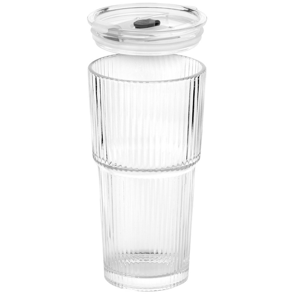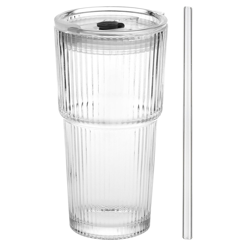 WYKONANE ZE SZKŁA Z RYFLOWANĄ POWIERZCHNIĄ - Kubki wykonane są z najwyższej jakości szkła w przezroczystym kolorze, posiadają ryflowaną powierzchnię. Pokrywki wykonane są z tworzywa w przezroczystym kolorze, a słomki ze szkła.