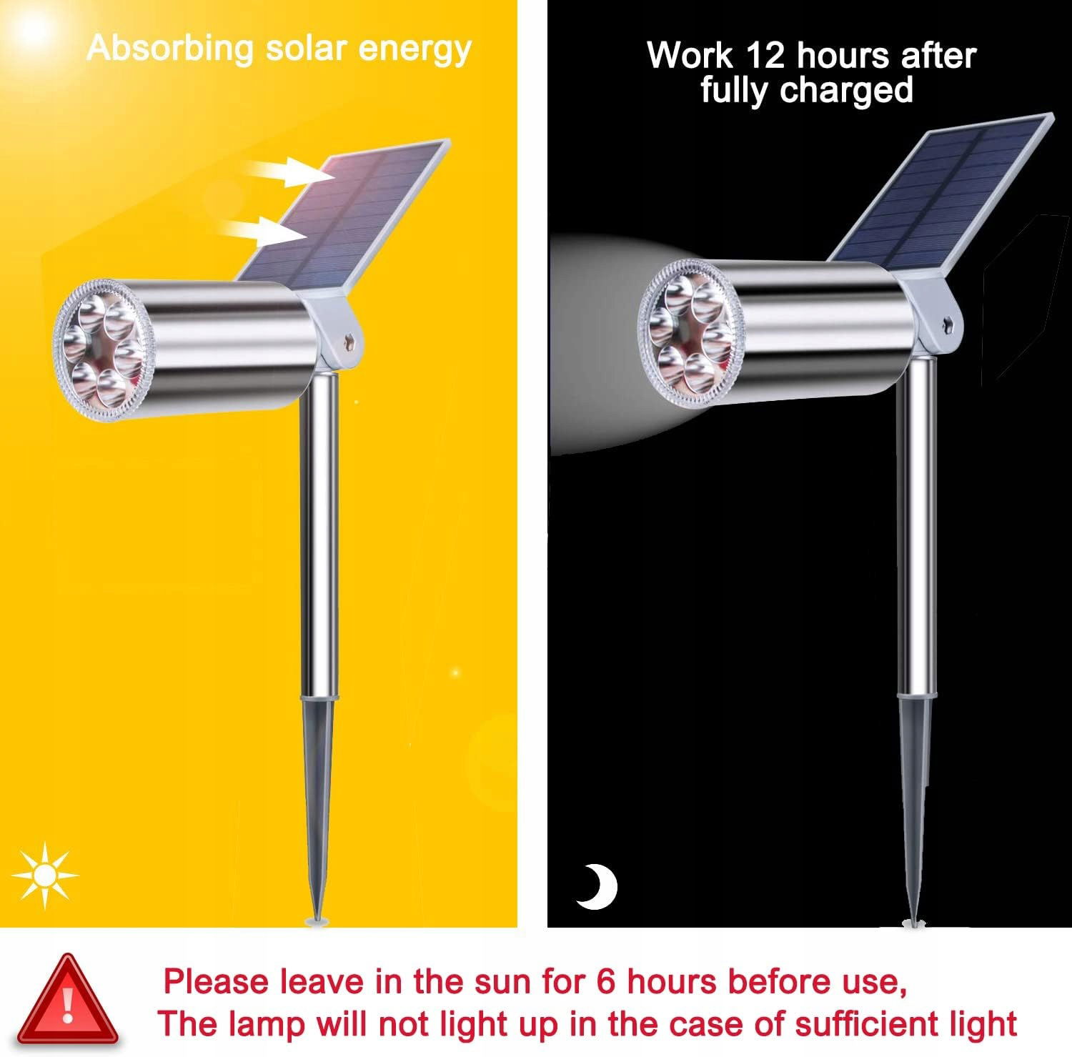 - Zasilana energią słoneczną – jasna lampa solarna z 6 diodami LED. Konstrukcja z dużym panelem słonecznym, aby absorbować więcej światła słonecznego i wbudowany akumulator litowy 18650 (1200 mAh) do ponownego ładowania.