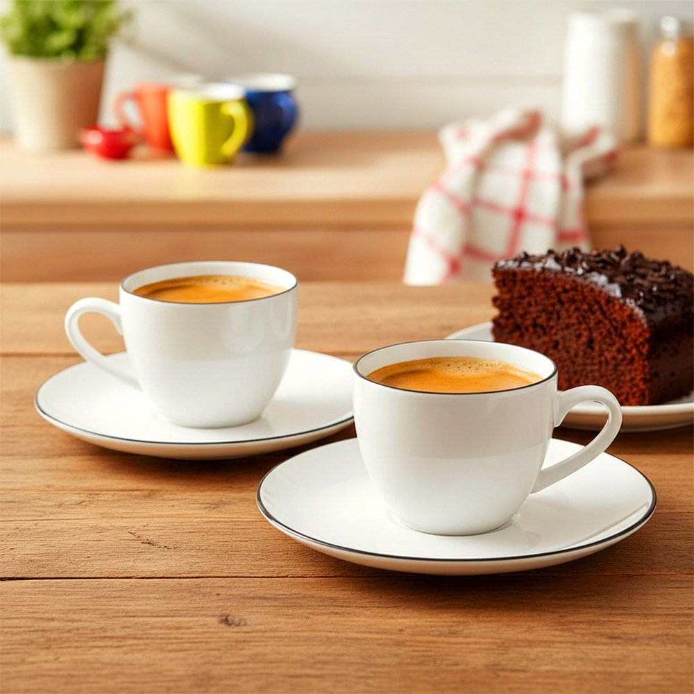 Zestaw dwóch filiżanek ze spodkiem przeznaczonych do picia małej porcji kawy np. espresso. Odpowiedni rozmiar filiżanek sprawia, że napoje prezentują się w nich pięknie, a spodek dodaje im stylu. Dobrze komponują się z pozostałą zastawą na stole.