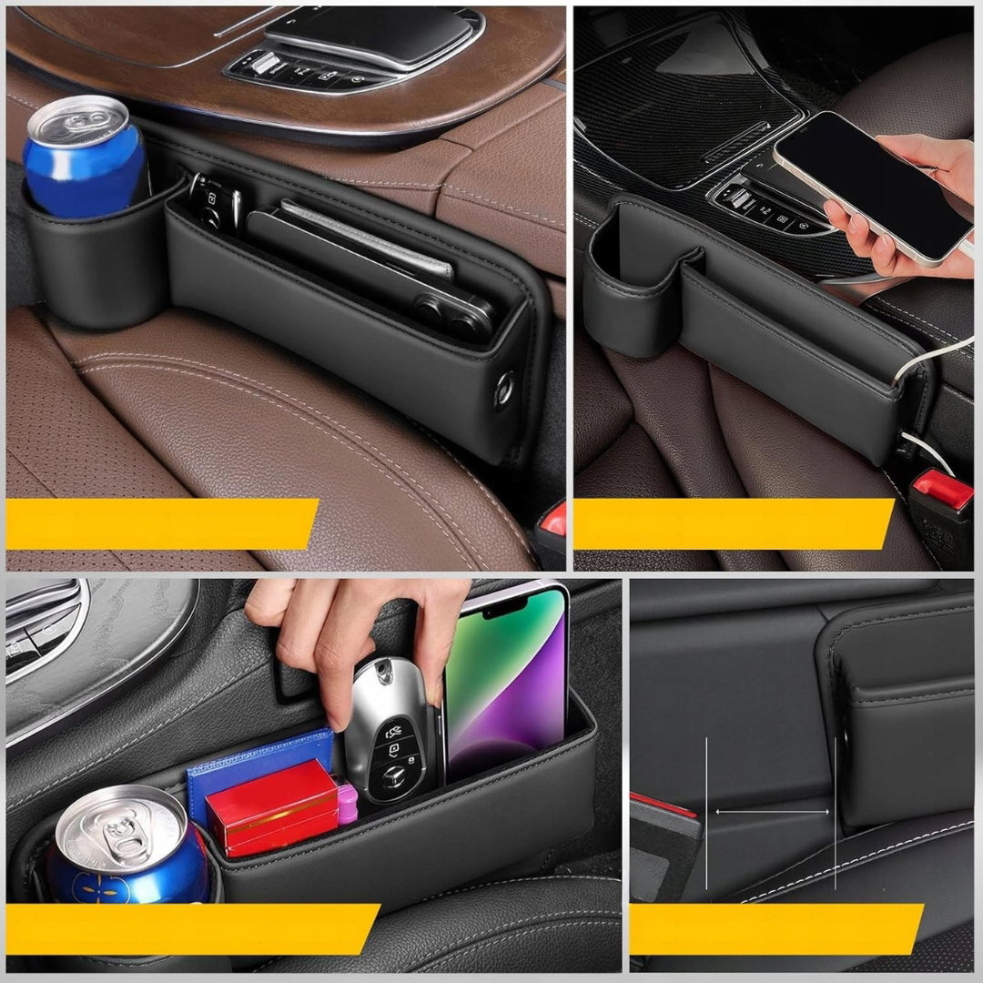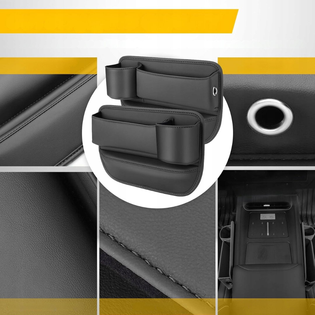 - Wielofunkcyjny organizer samochodowy: praktyczny pojemnik między siedzenia to prawdziwy niezbędnik w codziennej jeździe. Dzięki licznym przegródkom i kieszeniom, w tym otworom na kable do ładowania urządzeń, pozwala utrzymać porządek i szybki dostęp do portfela, kluczy, telefonu czy napojów.
