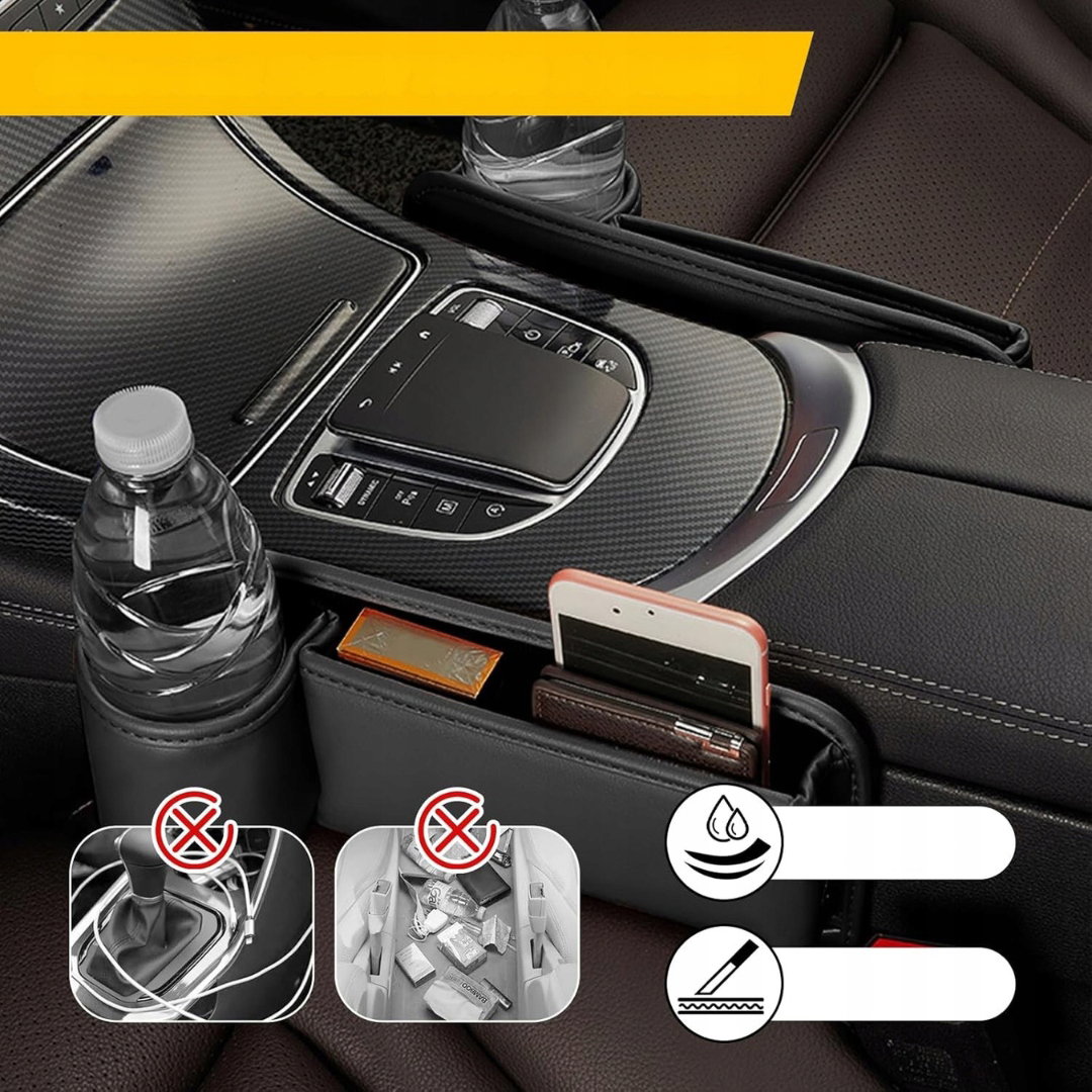 - Łatwa instalacja i oszczędność miejsca: montaż odbywa się bez użycia narzędzi – wystarczy wsunąć organizer w przestrzeń między fotelem a konsolą środkową. Dzięki kompaktowym wymiarom (30 × 20 cm) nie wpływa na komfort siedzenia, zapewniając jednocześnie wygodny dostęp do najpotrzebniejszych rzeczy.