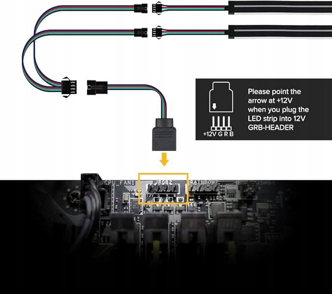 Ważne: Upewnij się, że Twoja płyta główna obsługuje 4-pinowe złącze RGB (+12V GRB). Nie podłączaj taśmy do 3-pinowego 5V RGB_HEADER – może to spowodować trwałe uszkodzenie taśmy LED.