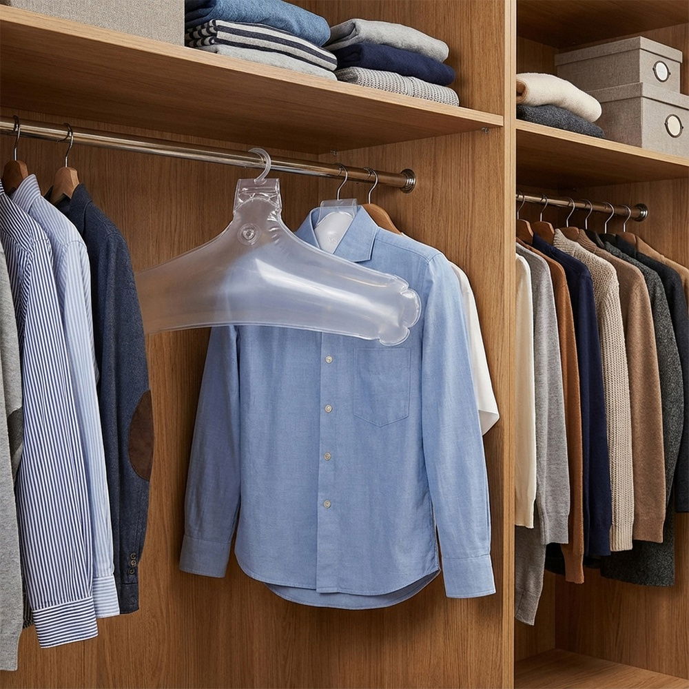 Odpowiednie do delikatnych i podatnych na odkształcenia tkanin - Poszerzona forma, dzięki nadmuchaniu wieszaka pomaga zachować naturalny kształt koszul, bluzek, swetrów czy marynarek, co jest szczególnie istotne podczas suszenia ubrań w warunkach hotelowych.