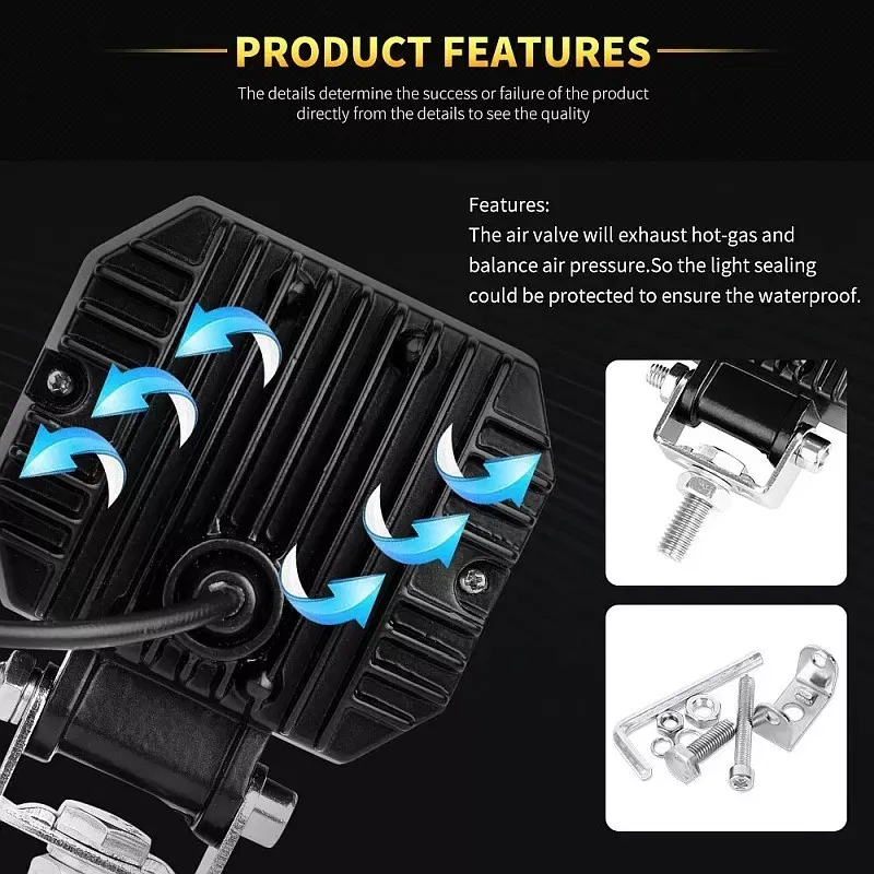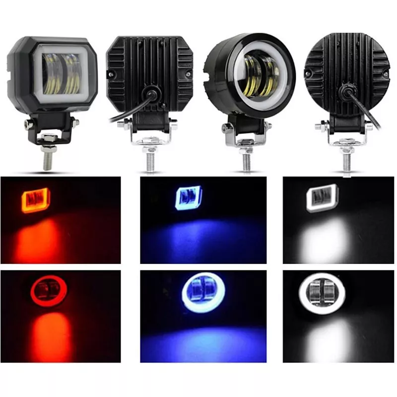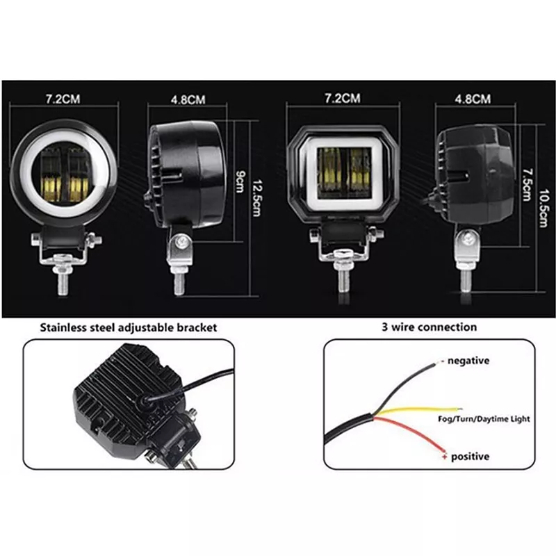 W lampach zostały zastosowane diody LED CREE z doskonałą optyką dającą dużo światła. Dołączony do zestawu podwójny przełącznik pozwoli na obsługę lampy i ringu. Dodatkowo lampa obrysowana jest świecącym na biało LED owym ringiem, który można włączyć osobno. Uzyskujemy dzięki temu bardzo fajny efekt wizualny. Lampy są odporne na wstrząsy, zabrudzenia i wodę. Dodatkowy reflektory LED do motocykli, rowerów, rowerów, samochodów osobowych, ciężarowych, łodzi. Halogeny posiadają trzy tryby pracy po kolejnym włączeniu .