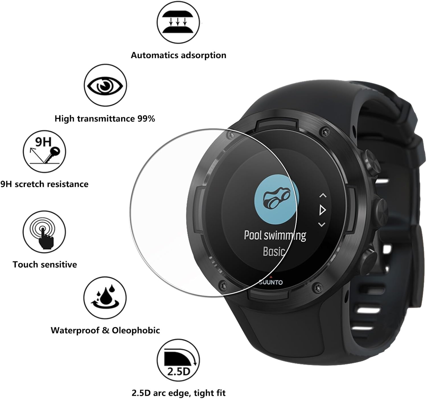 Przyjazny dla etui - Ta folia ochronna na ekran jest wykonana ze szkła hartowanego i zakrywa tylko płaską powierzchnię ekranu zegarka. Zazwyczaj folia ochronna jest mniejsza od samego ekranu, aby zapobiec powstawaniu pęcherzy i łuszczeniu się na krawędziach. Jeśli Twój zegarek ma zaokrąglone krawędzie, zalecamy zakup folii ochronnej mniejszej od ekranu zegarka.