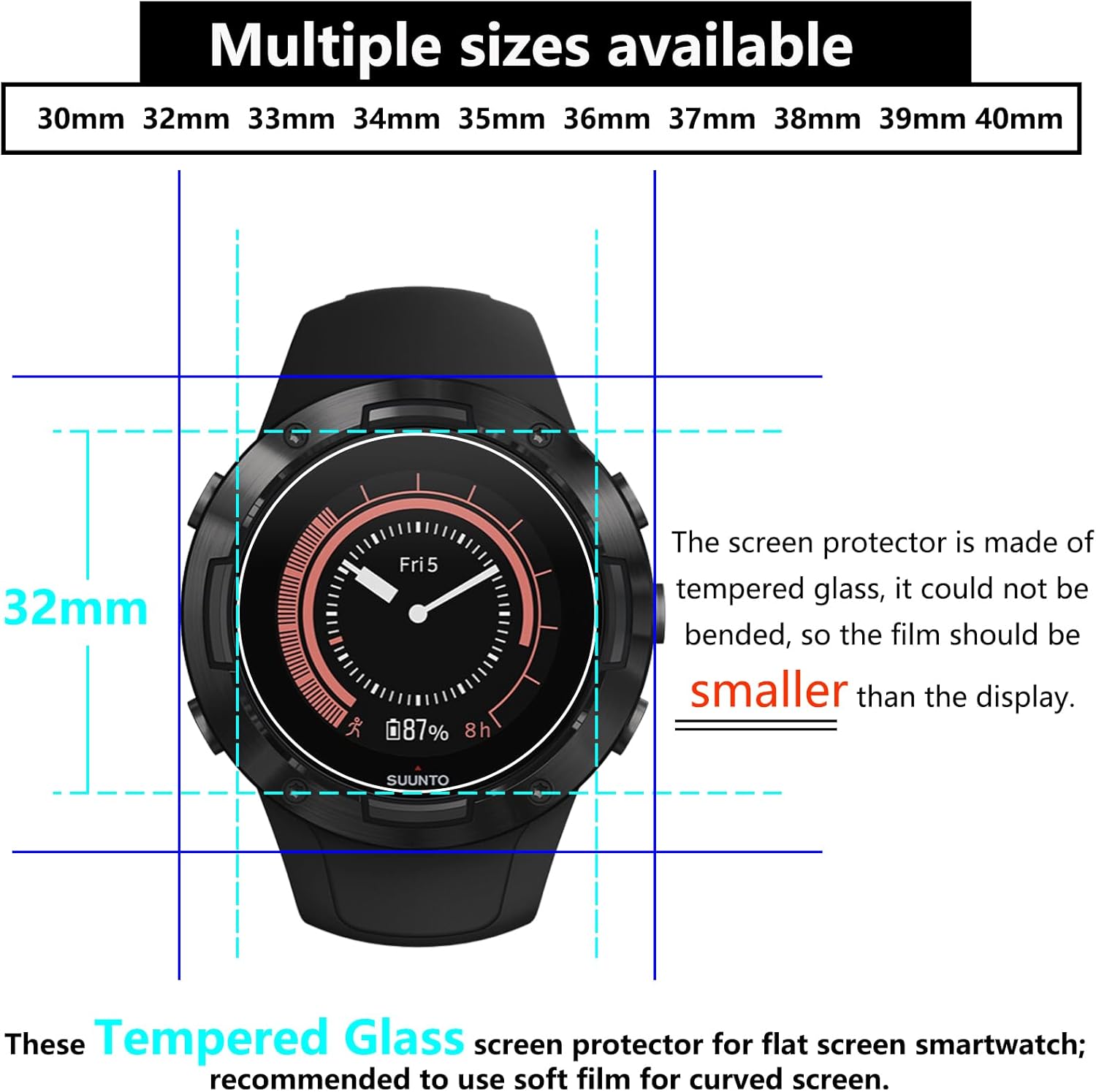 Specjalnie do Twojego smartwatcha - Średnica tej folii ochronnej wynosi 32 mm/1,26 cala. Precyzyjne cięcie laserowe zapewnia doskonałą ochronę wyświetlacza zegarka. Idealnie pasuje do płaskiego ekranu zegarka o średnicy 32 mm.