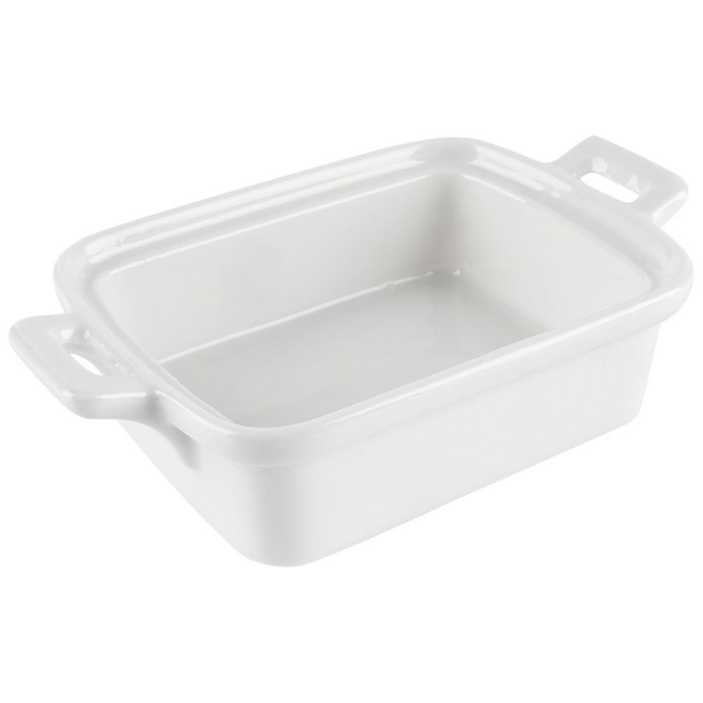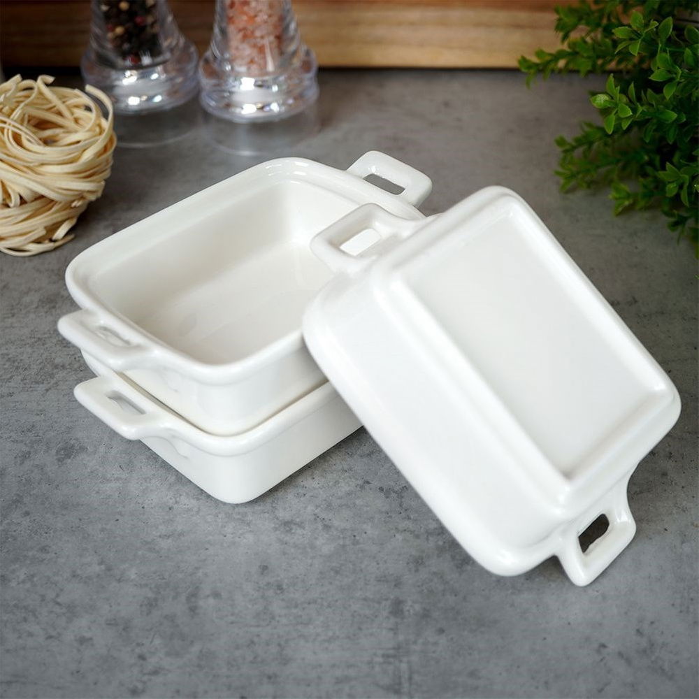 ŻAROODPORNE - Zestaw 3 sztuk miseczek do zapiekania w prostokątnym kształcie z uchwytami. Każda z miseczek ma wymiar zewnętrzny: 14 x 9 x 4,5 cm i pojemność 160 ml.