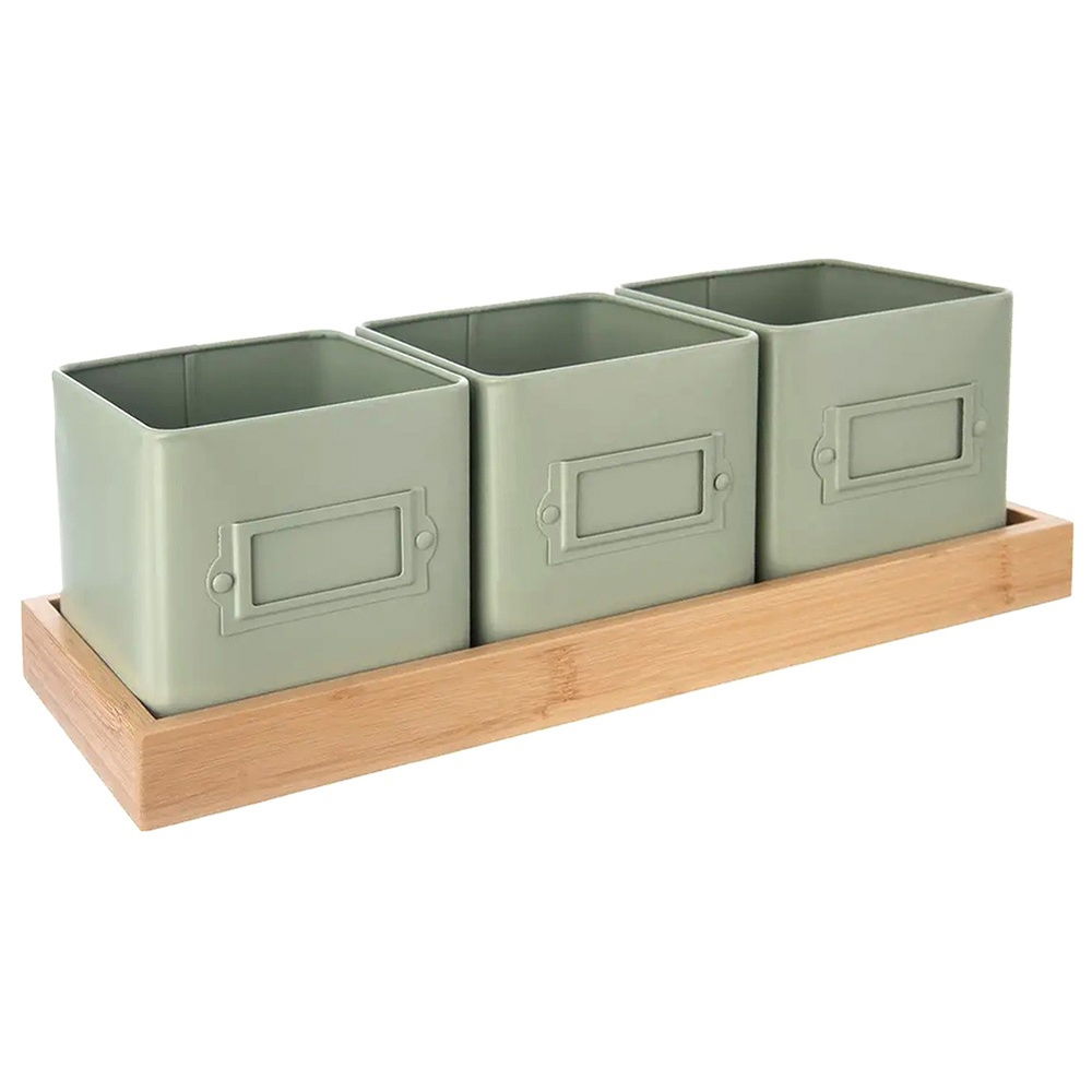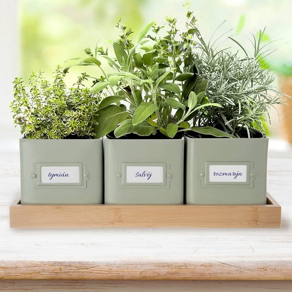 Zestaw trzech osłonek na doniczki z ziołami - Zestaw składa się z trzech osłonek na doniczki oraz podstawki. Idealne do uprawy świeżych ziół w kuchni lub na parapecie. Każda osłonka ma wymiary 11 x 11 x 11 cm a zestaw doniczek na podstawce ma wymiar 37 x 13,5 x 12 cm. Osłonki na doniczki z serii Greenish.