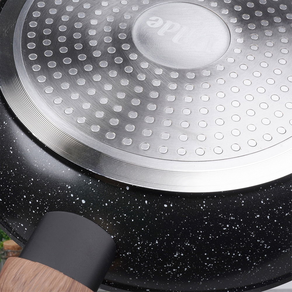NIEPRZYWIERAJĄCE - Patelnie wykonane z aluminium z nieprzywierającą powłoką granitową w czarnym kolorze. Powierzchnia nieprzywierająca umożliwia przygotowywanie zdrowych i smacznych posiłków z minimalną ilością tłuszczu. Wyposażone w uchwyty wykonane z najwyższej jakości, wytrzymałego tworzywa imitującego drewno.