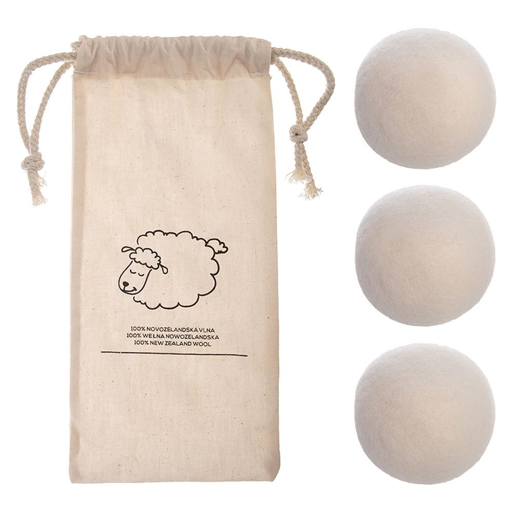 Zestaw 3 szt. piłek do suszarki - Piłki do o średnicy 7 cm, doskonale absorbują wilgoć podczas cyklu prania. Dzięki temu skracają czas suszenia ubrań oraz poprawiają ich świeżość. W zestawie znajdują się 3 szt. w bawełnianym woreczku.