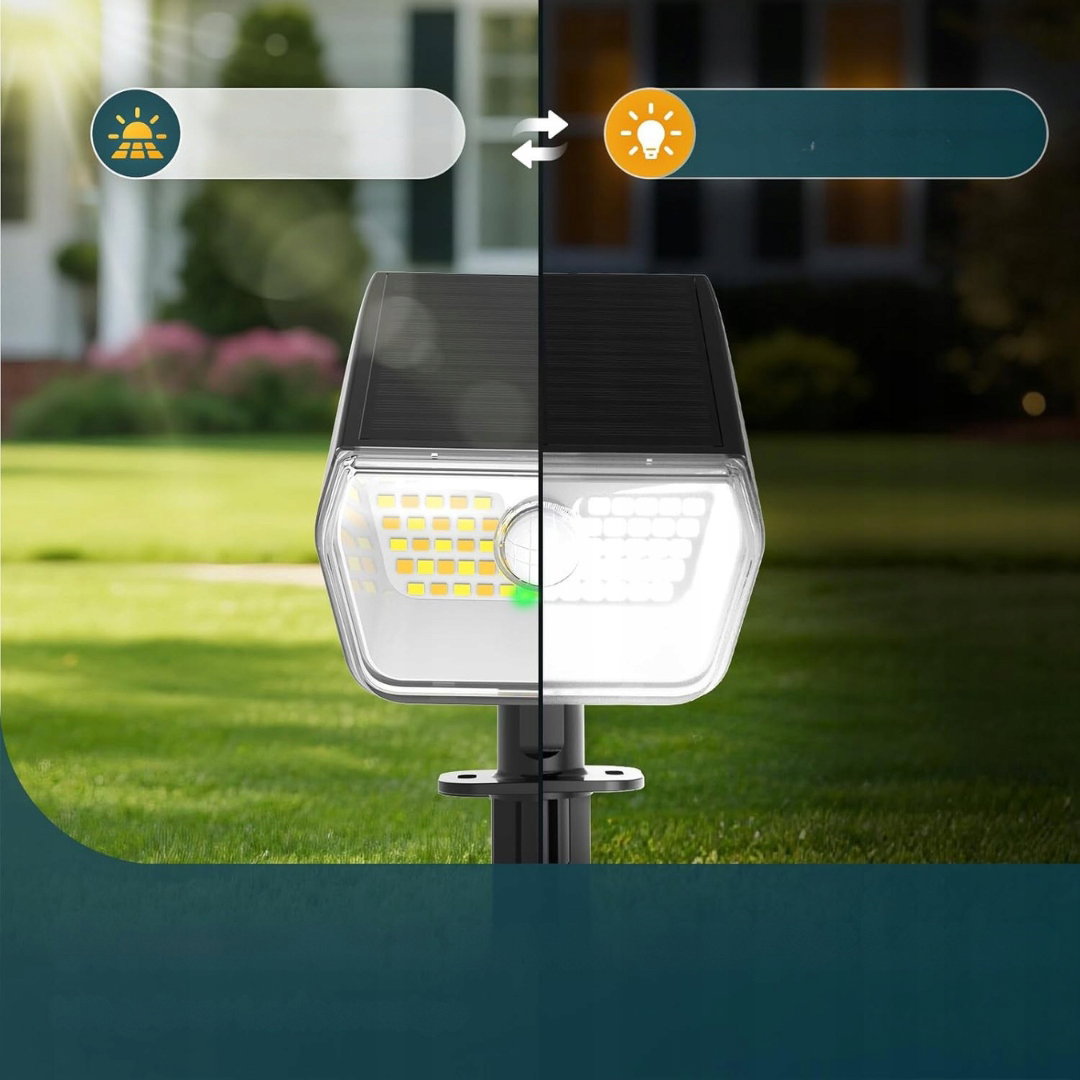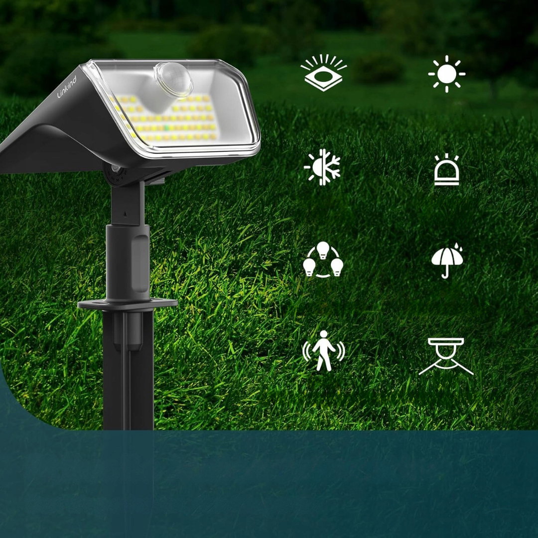 Linkind lampy solarne do użytku zewnętrznego z czujnikiem ruchu, ciepłe białe i zimne białe, 60 diod LED, światło zewnętrzne 800 lm z ciągłym światłem i wskaźnikiem ładowania, reflektor solarny z akumulatorem klasy S, IP67, czujnik ruchu.