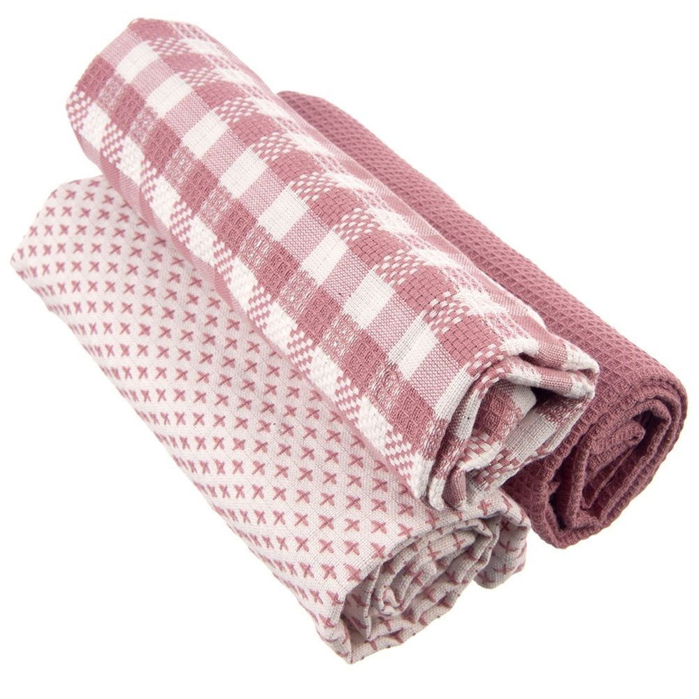 Komplet trzech ścierek kuchennych w trzech różnych wzorach. Ścierki prezentują się bardzo elegancko, są bardzo przydatne podczas codziennych prac w kuchni, możemy wykorzystać je zarówno do wycierania naczyń, rąk, ale również jako serwetkę na stół. Wyróżniają się dużą chłonnością oraz trwałością.