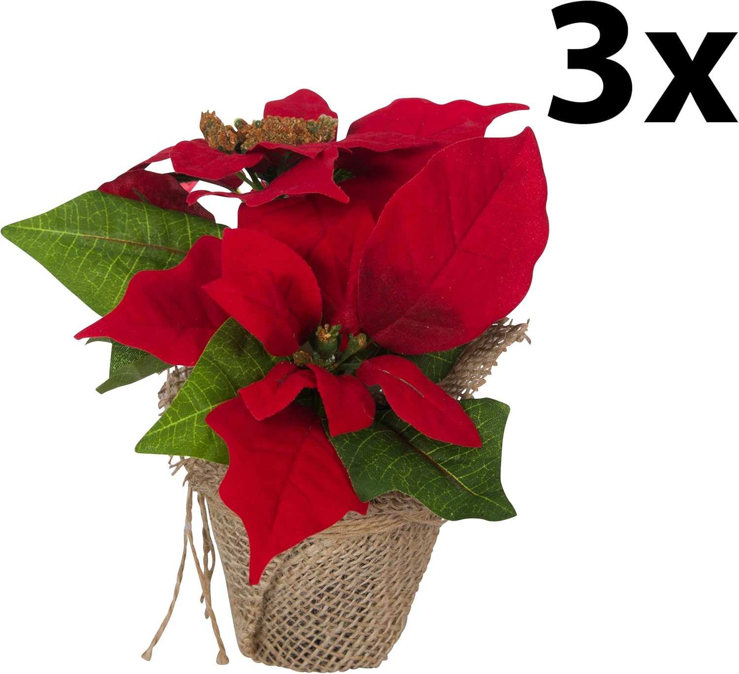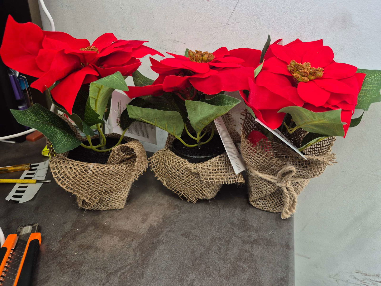 Kwiat zachwyca realistycznym wyglądem poinsencji, a dzięki tkaninie jutowej i braku sadzarki, możesz go łatwo dopasować do każdego miejsca. Kolory czerwony i biały idealnie wkomponują się w świąteczny wystrój.