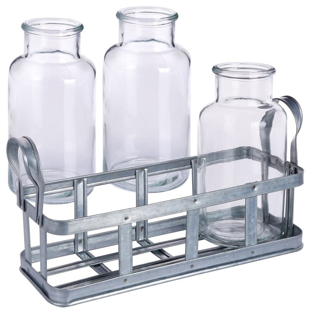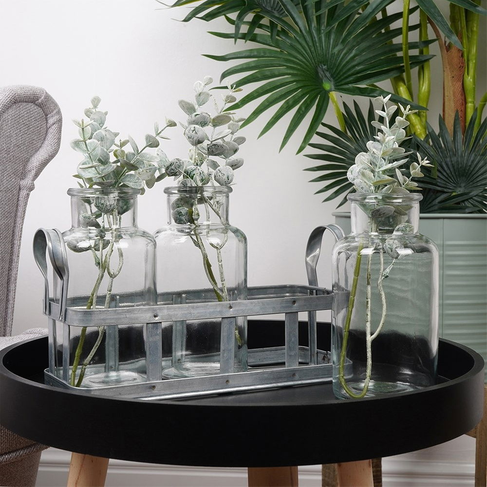 Zestaw trzech wazonów na kwiaty ze stojakiem, przydatny w każdym domu. Idealny do przechowywania kwiatów żywych oraz sztucznych, a także dekoracji. Zestaw pozwoli stworzyć różnorodne kompozycje kwiatowe lub wyeksponować kilka rodzajów kwiatów jednocześnie. Przezroczysta forma wazonów pozwoli na wygodne monitorowanie poziomu wody. Stojak zapewnia stabilne przechowywanie wazonów i umożliwia ich łatwe przenoszenie. Zestaw będzie stanowił ozdobę sam w sobie.