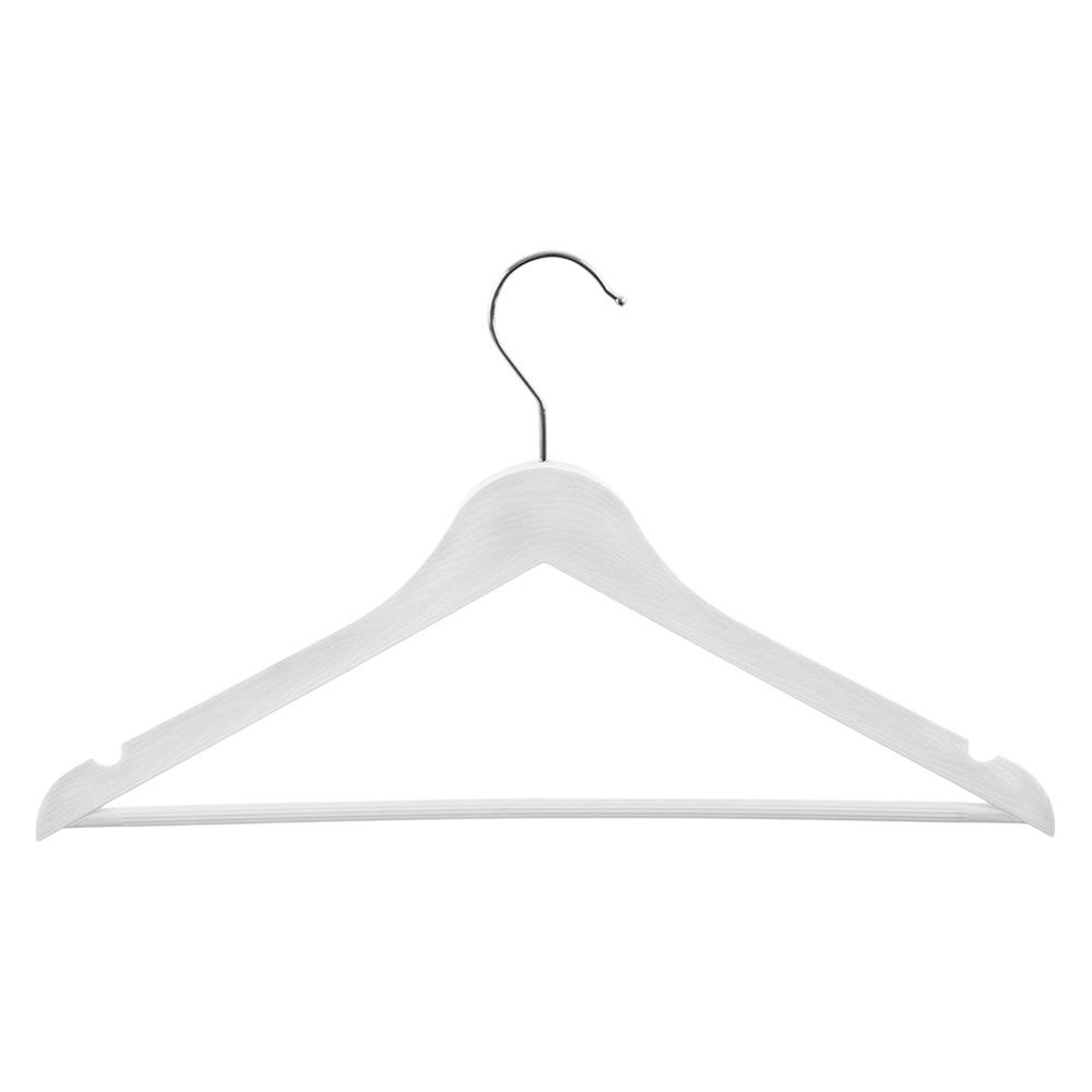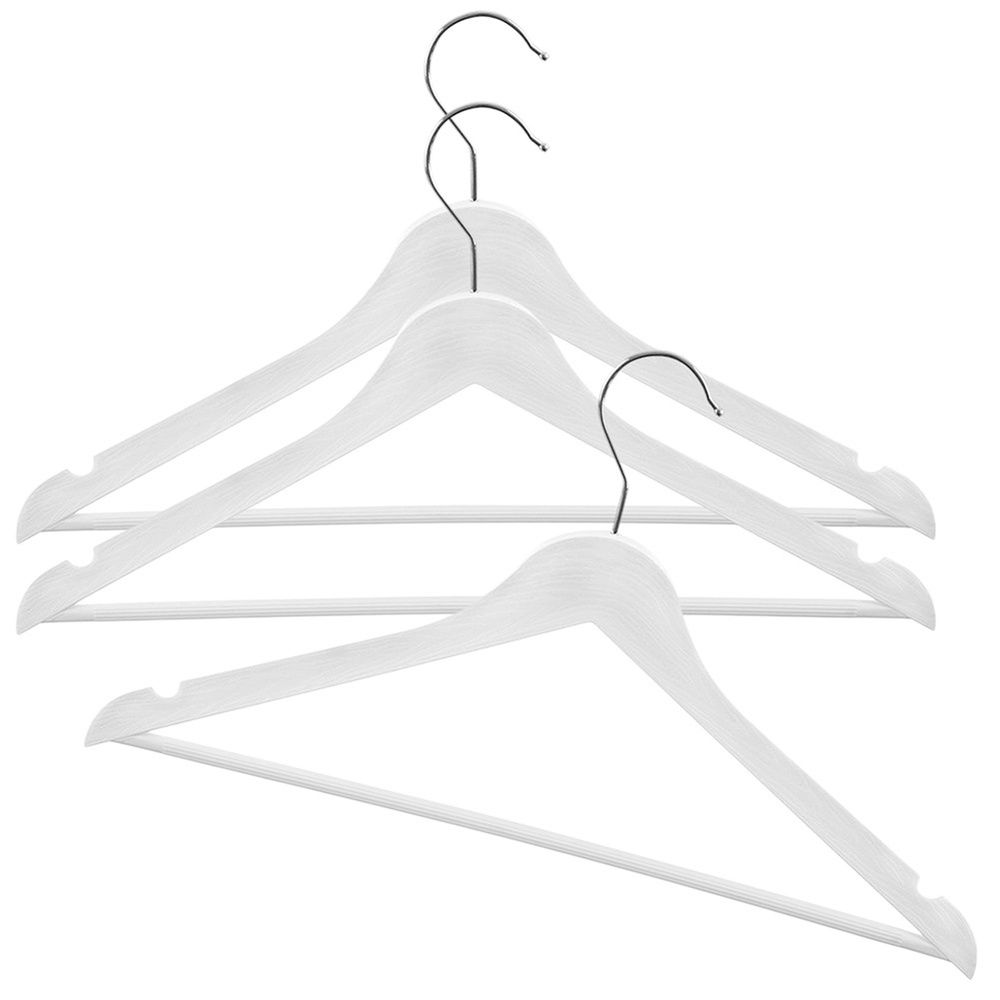 Zestaw 3 szt. wieszaków na ubrania - Zestaw 3 uniwersalnych wieszaków na ubrania w kolorze białym. Idealne dla osób ceniących praktyczne rozwiązania, pomogą zorganizować odpowiednio przestrzeń w szafie. Wieszaki są niezbędne w każdym domu a także sklepie z odzieżą. Dzięki nim wygodnie zawiesimy ubrania w szafie. Każdy wieszak ma wymiary 42,5 x 24 x 1 cm.