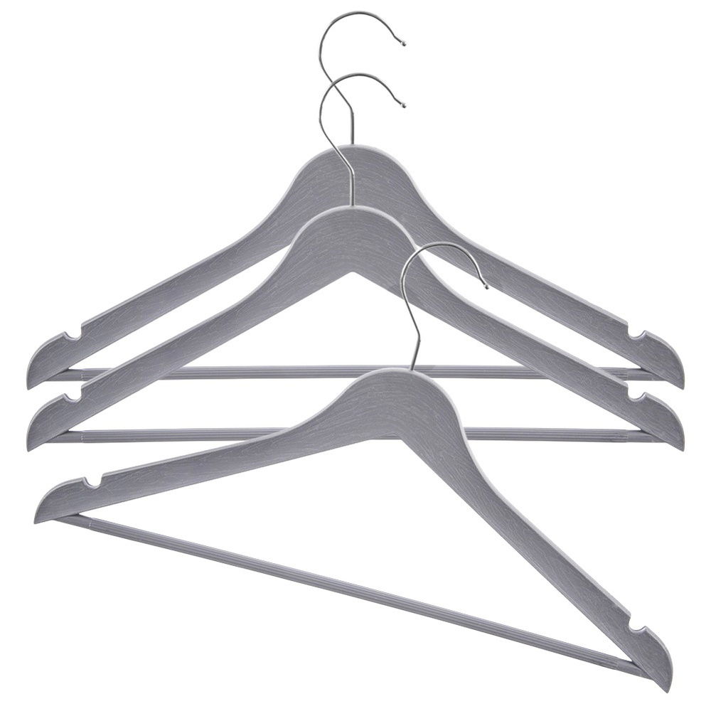 Zestaw 3 szt. wieszaków na ubrania - Zestaw 3 uniwersalnych wieszaków na ubrania w kolorze szarym. Idealne dla osób ceniących praktyczne rozwiązania, pomogą zorganizować odpowiednio przestrzeń w szafie. Wieszaki są niezbędne w każdym domu a także sklepie z odzieżą. Dzięki nim wygodnie zawiesimy ubrania w szafie. Każdy wieszak ma wymiary 42,5 x 24 x 1 cm.