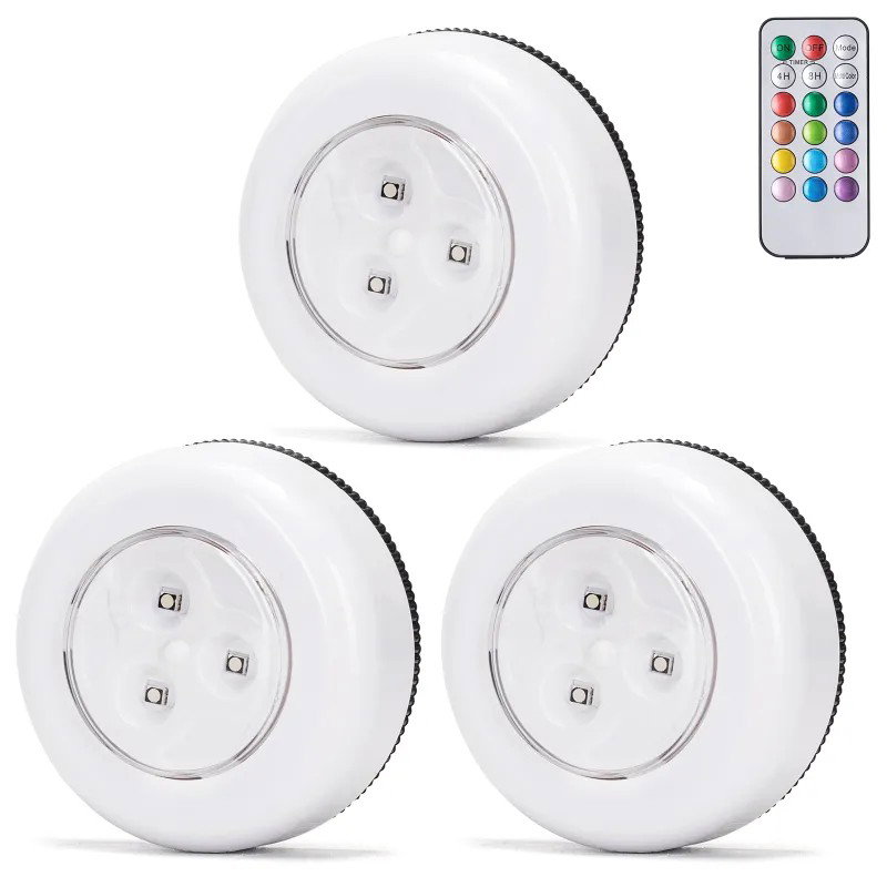 Trzy lampki nocne led na z 3 baterie AAA z barwnymi diodami RGB i jednym pilotem do zdalnego sterownia. Lampki można powiesić, postawić lub po prostu przykleić. Łatwe w obsłudze, pilot zapewnia wybór jednego z 12 zaprogramowanych kolorów i timera.