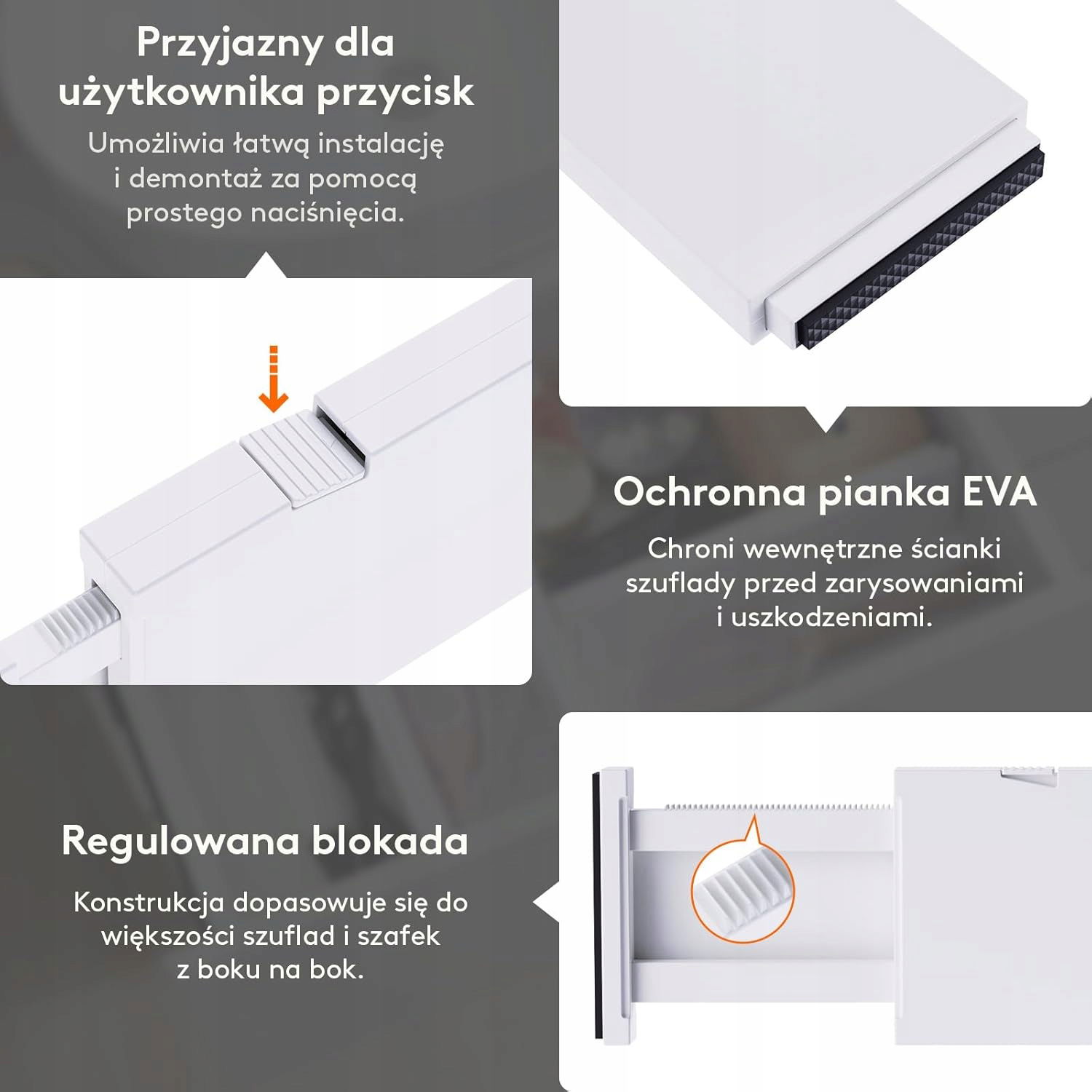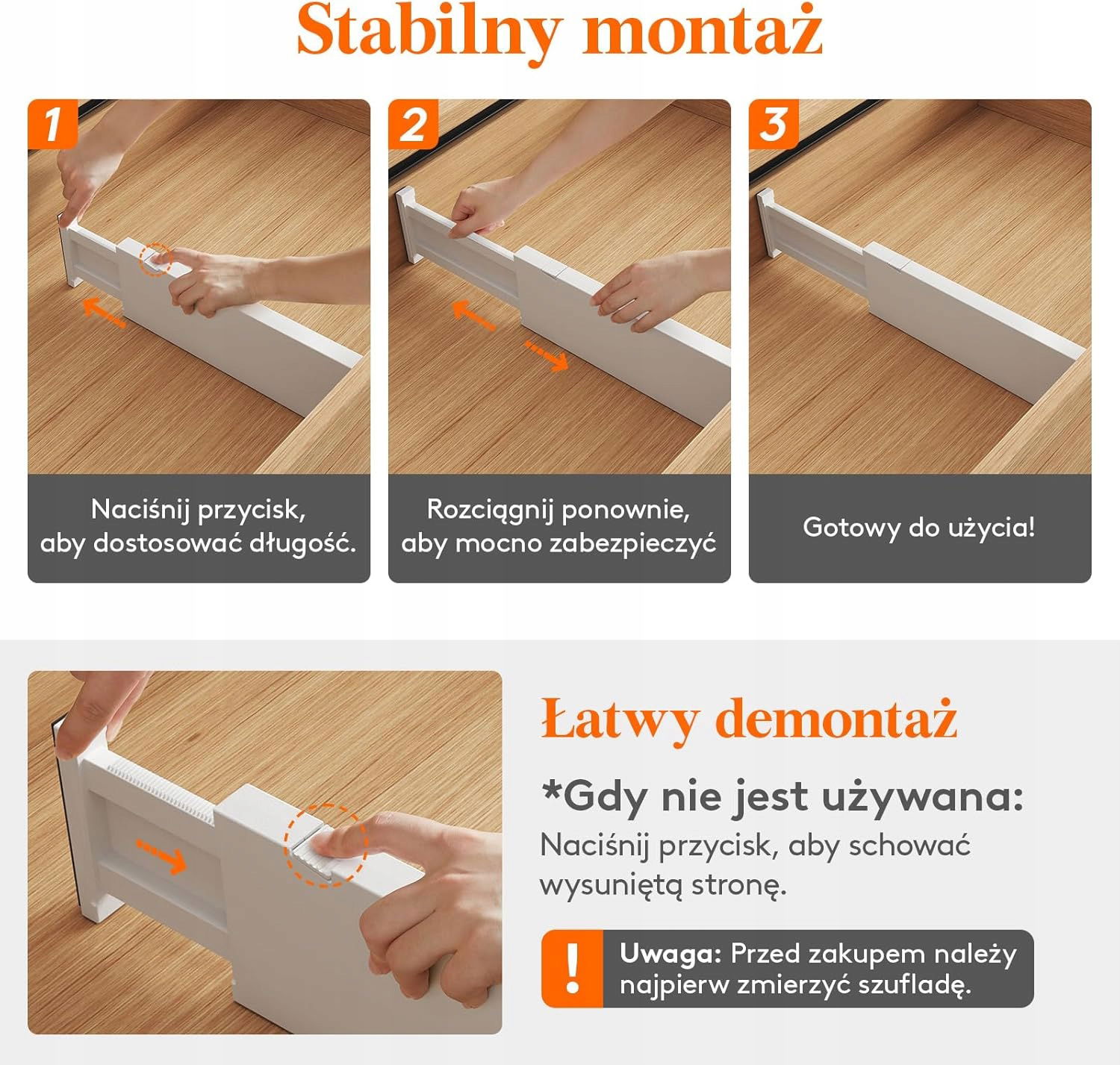 Regulowana długość – od 28 cm do 44,5 cm, wysokość 10 cm, szerokość 2 cm – pasuje do większości szuflad